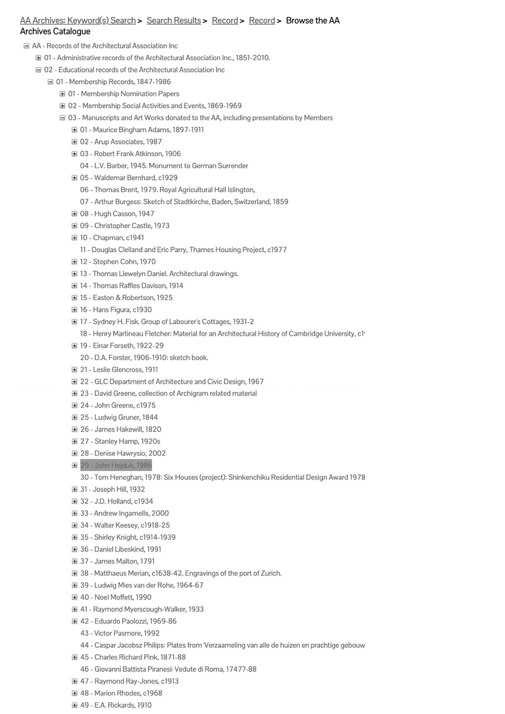 Digital interface of the AA Archives website, displaying a selected catalogue of student work produced in response to John Hejduk for a 1986 exhibition. An example of how archival material is currently accessed and presented online.