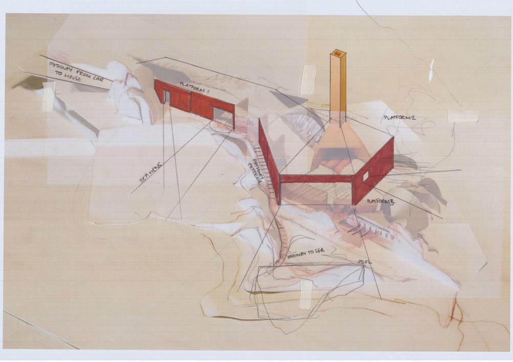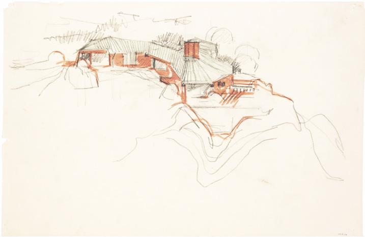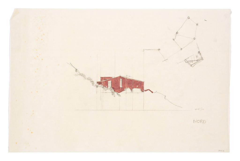The selected drawing is an elevation sketch by Alberto Ponis of Casa Scalesciani, a coastal house in Sardinia. The response model, originally produced for the Alternative Histories exhibition, was made by Flores & Prats Architects in Barcelona. These two archival pieces form the basis of the study over the coming weeks