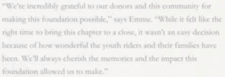 “We’re incredibly grateful to our donors and this community for making this foundation possible,” says Emme. “While it felt like the right time to bring this chapter to a close, it wasn’t an easy decision because of how wonderful the youth riders and their families have been. We’ll always cherish the memories and the impact this foundation allowed us to make.”
