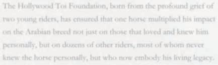 The Hollywood Toi Foundation, born from the profound grief of two young riders, has ensured that one horse multiplied his impact on the Arabian breed not just on those that loved and knew him personally, but on dozens of other riders, most of whom never knew the horse personally, but who now embody his living legacy.