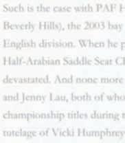 Such is the case with PAF Hollywood Toi (Matoi x NM Beverly Hills), the 2003 bay gelding who excelled in the English division. When he passed away during the 2014 Half-Arabian Saddle Seat Championship class, everyone was devastated. And none more so than riders Emme Moore and Jenny Lau, both of whom rode the gelding to championship titles during their youth careers under the tutelage of Vicki Humphrey and Jessica Clinton.