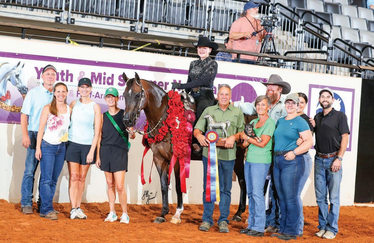 ere were also a lot of special classes that make coming to the Youth and Mid Summer Nationals show worthwhile. e Arabian Hunter Pleasure Association puts on an amateur purebred and Half-Arabian pleasure class open to kids and adults that includes a stand-up portion of the class where the horses are untacked and judged on conformation. Similarly, the Arabian Western Pleasure Association hosts a maturity where amateurs show and stand up their junior western horses. At U.S. Nationals, the AHPA and AWPA classes are ridden by professionals, so it is extra special to be able to compete for the chance to win one of these prestigious classes on the national level as an amateur. e AHPA also puts on two hunt seat equation classes for the youth to show in the main arena, as most equitation classes happen in the Specialty Arena. is year, the 18 & Under class had 35 entries with Mckenna Bein taking the top spot, while Lyla Diver won the walk/trot class.