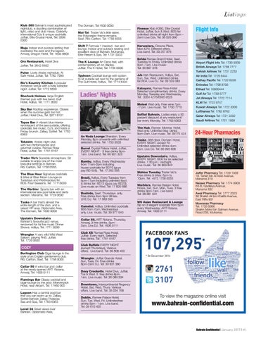 Cellar 59, ART Rotana, Thursday, Amwaj, 3 free drinks. 5pm2am. Live DJ. Tel: 1600 0111 Club XS Ramee Rose Hotel, Juffair. Every night, Selected free drinks. Tel: 1761 6167 Club Buffalo EVERY NIGHT (except Thursdays). Various offers. Live band. Tel: 39 508 403 Wrangler, Juffair Grande Hotel, Sun, Tues, Fri. Free drinks 8pm-2am! DJ. Tel: 39 831 380 Davy Crocketts, Hotel Diva, Juffair, Tue & Wed. 5 free drinks 8pm1am. Live music. Tel: 36 089 534 Downtown, Intercontinental Regency Hotel, Sat, Wed, Thurs. Various offers. Live band. Tel: 35 034 768 Dublin, Ramee Palace Hotel, Sun, Tue, Wed, Fri. Unlimitedfree drinks 9pm - 1am. Live band. Tel: 39 610 405