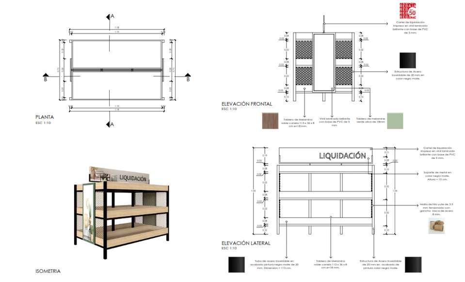 En los cortes y las elevaciones se podrán visualizar el espacio interior de la tienda, y como estos interactúan con los mobiliarios para destacar la organización de una tienda comercial, y las medida antropométricas necesarias para el confort dentro de la tienda.