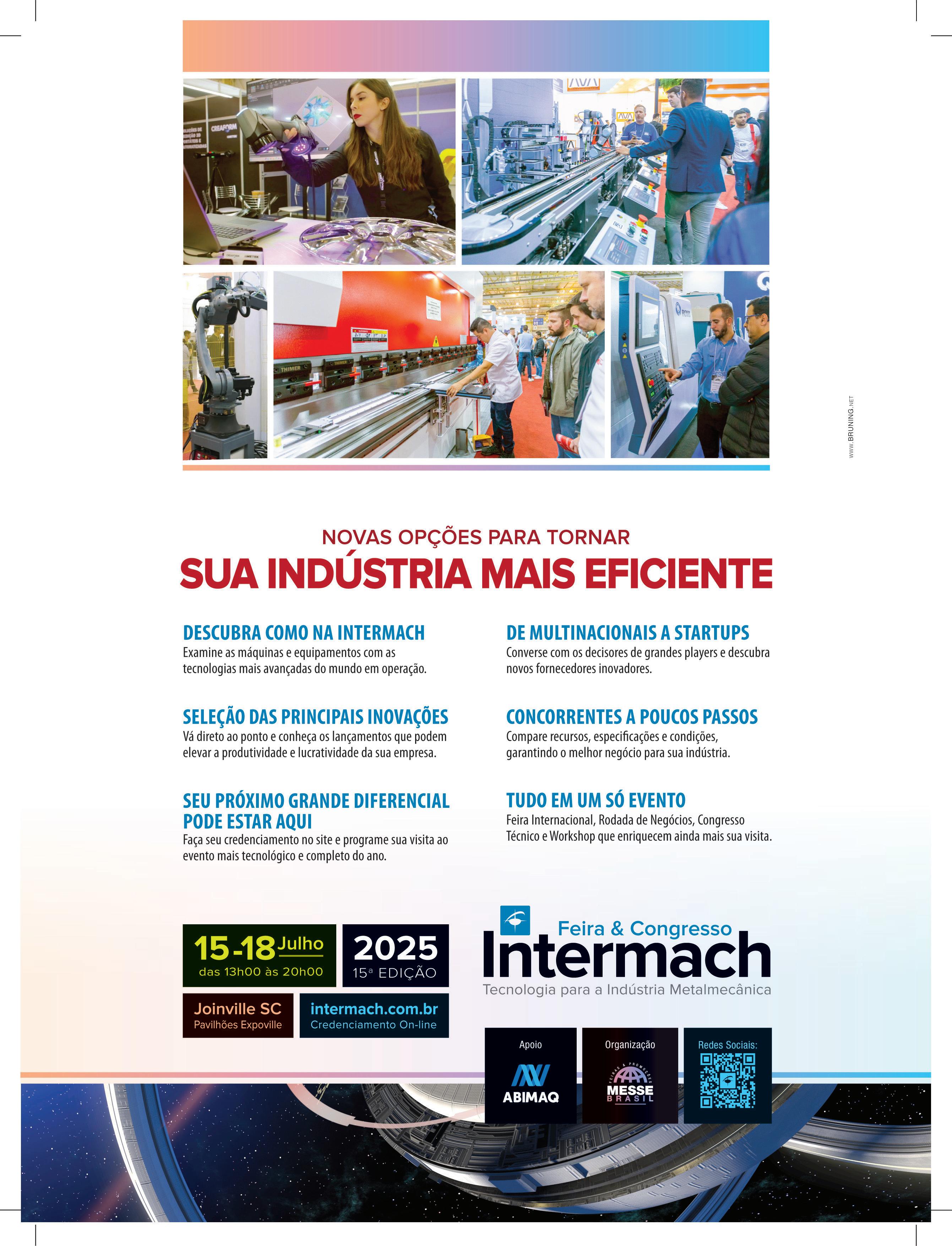 Mais informações sobre esses avanços tecnológicos estão nas notícias desta edição de Corte e Conformação de Metais a partir da página 4. Também nesta edição, um estudo para avaliar os revestimentos de chapas de aço com carbeto de tungstênio, aplicados pelos processos de soldagem oxiacetilênica e por aspersão térmica, foi realizado por pesquisadoras brasileiras. Confira também as atrações da Intermach, que terá uma exposição de máquinas e equipamentos, além de um congresso do setor metalmecânico.