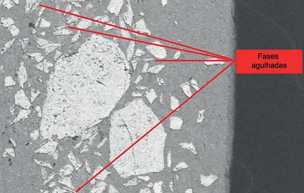 A figura 6 possibilita a identificação das fases duras e da matriz do revestimento por aspersão térmica HVOF, sendo as partículas de WC mostradas na cor cinza claro, dispersas na matriz de cobalto (cinza escuro). As maiores partículas de WC encontradas foram identificadas na imagem, sendo a maior delas com comprimento de 0,007 mm, o que representa 0,71% do tamanho da maior partícula encontrada na amostra revestida por soldagem. Pode-se verificar que a distribuição de WC é abundante e uniforme e não são identificados sinais de degradação das partículas duras (formato de agulhas), sendo essas características da microestrutura favoráveis à obtenção de uma maior resistência ao desgaste (4,14,23,32)