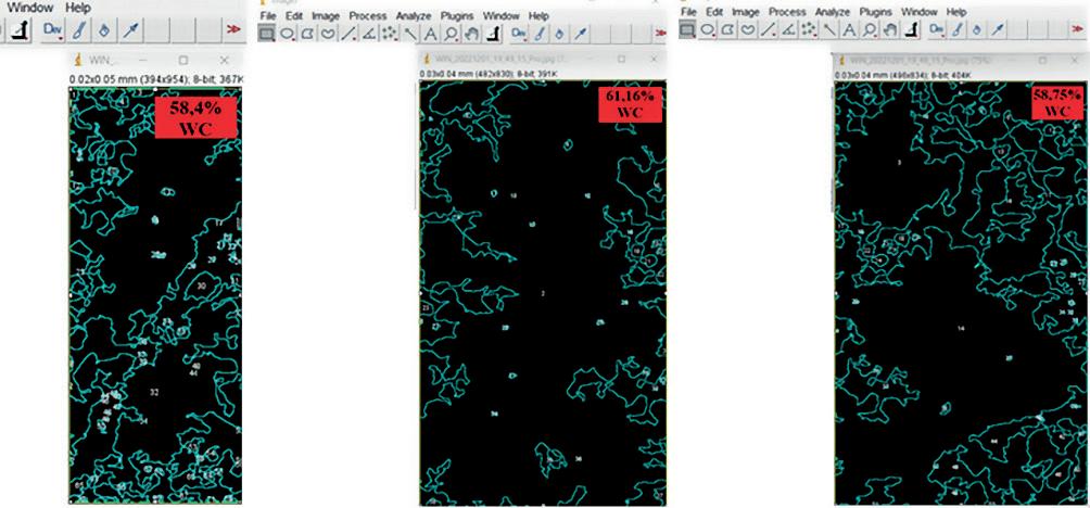Fig. 8 – Regiões de análise (software) da quantidade de WC da amostra revestida por aspersão térmica HVOF.