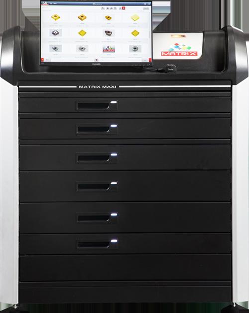 A IMC, com sedes em diversos países, desenvolveu uma linha de gabinetes automatizados para parques fabris como, por exemplo, o modelo Maxi (foto acima), que conta com painel digital com tela de 17” sensível ao toque (touch screen). Essa versão de gabinete possui até 12 gavetas com trava eletrônica automática, nas quais podem ser armazenadas ferramentas para corte ou desbaste de peças metálicas, assim como brocas, insertos e dispositivos para metrologia, entre outros.