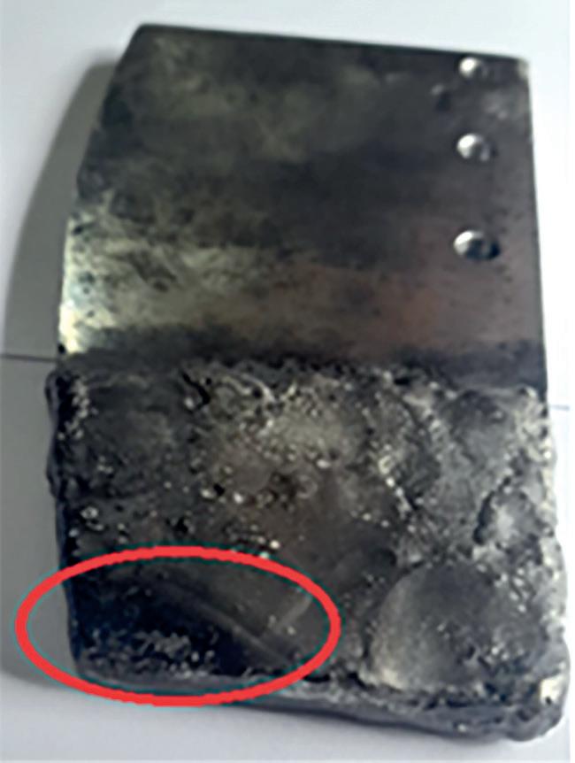 A figura 9 mostra a pá soldada e o desgaste após o teste. A região mais escura da pá (circulada em vermelho) apresentou um desgaste perceptível visualmente, quantificado em 0,64 mm, mostrado no ponto 10 de controle de espessura. A pá revestida por HVOF apresentou desgaste maior que 0,09 mm, no ponto 4, não sendo possível perceber esse desgaste visualmente. Na figura 10 pode-se observar na área verde o desgaste médio total ao longo das 600 horas de ensaio e a na área amarela a projeção do desgaste total dos revestimentos. O gráfico mostra que, em todos os intervalos de tempo, a amostra soldada apresentou desgaste superior em relação à revestida por HVOF. De acordo com os dados obtidos no ensaio real foi possível definir a equação de tendência de desgaste para cada pá. As equações podem ser visualizadas no gráfico. A área clara à direita (figura 10) representa o gráfico de tendência de desgaste.