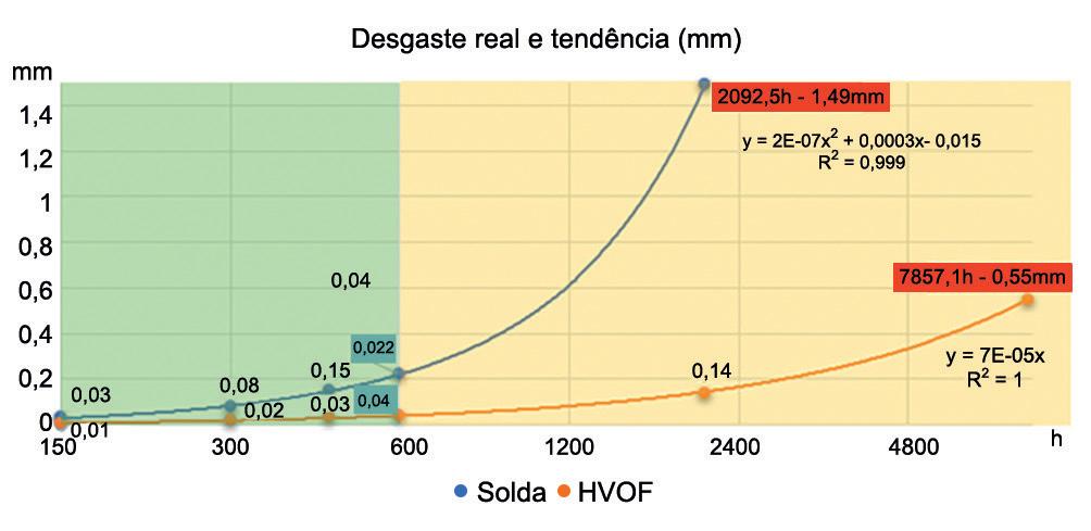 A tabela 2 mostra o resultado do teste prático para avaliação do desgaste dos revestimentos por soldagem oxiacetilênica e por aspersão térmica HVOF. A amostra soldada apresentou desgaste médio total de 0,22 mm ao final das 600 horas de ensaio, enquanto na amostra revestida por HVOF o desgaste médio total foi de 0,04 mm, que é 81,8% menor em relação à amostra soldada.