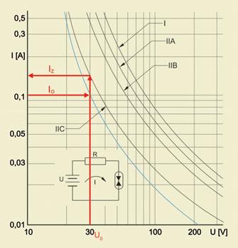 Fig. 2 – Curvas limite de ignição conforme DIN EN IEC 60079-11 [1]. Para 30 V resulta uma corrente máxima de 102 mA para o grupo IIC na zona 1.