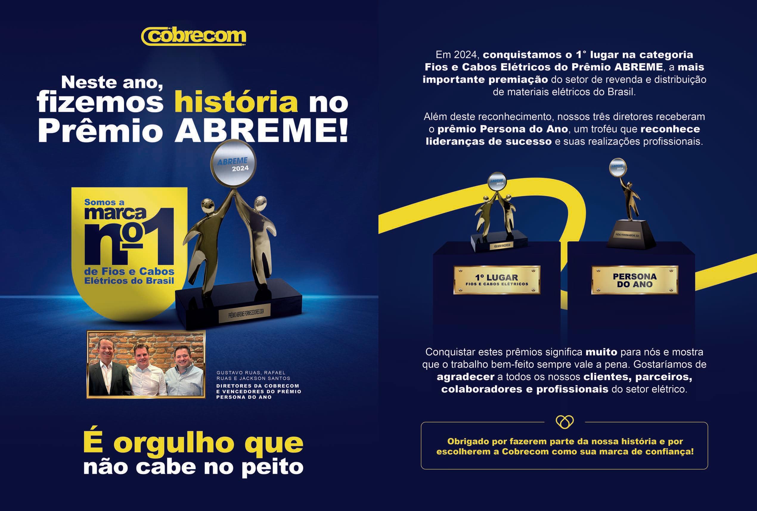A entidade também oferece o prêmio Persona, que reconhece um empresário do segmento de material elétrico como a personalidade do ano. Nesta modalidade, o premiado é indicado pela diretoria da Abreme. Os ganhadores foram os sócios da Cobrecom: Gustavo Ruas, Rafael Ruas e Jackson Santos.