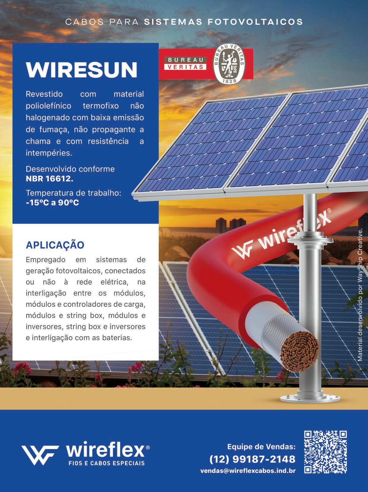 0,6/1kV com1,2,3e4 condutorespossuemcaracterísticasdenãopropagaçãoe autoextinçãodofogoecombaixa emissãodefumaça.Oscabossão indicados,respectivamente,para tensõesnominaisaté450/750Ve até0,6/1kV.Segundoaempresa,a isolaçãoHEPRdaslinhasoferece maiorresistênciaàionizaçãodo queoscompostosemPVCepolietileno.ACobrecomtambémfabricaocabo Solarcom,queatende asespeci caçõesdaNBR16612e NBRNM-280,alémdacerti cação internacionaldeconformidadeEN 50618,muitousadanaEuropa.O produtopodeserutilizadoeminstalações xas,emconexõesentreas placasepainéisfotovoltaicos,caixasdejunçõesatéosinversoresdo sistemadegeraçãodeenergiasolar, suportandocondiçõesextremasde temperaturaeintempéries.