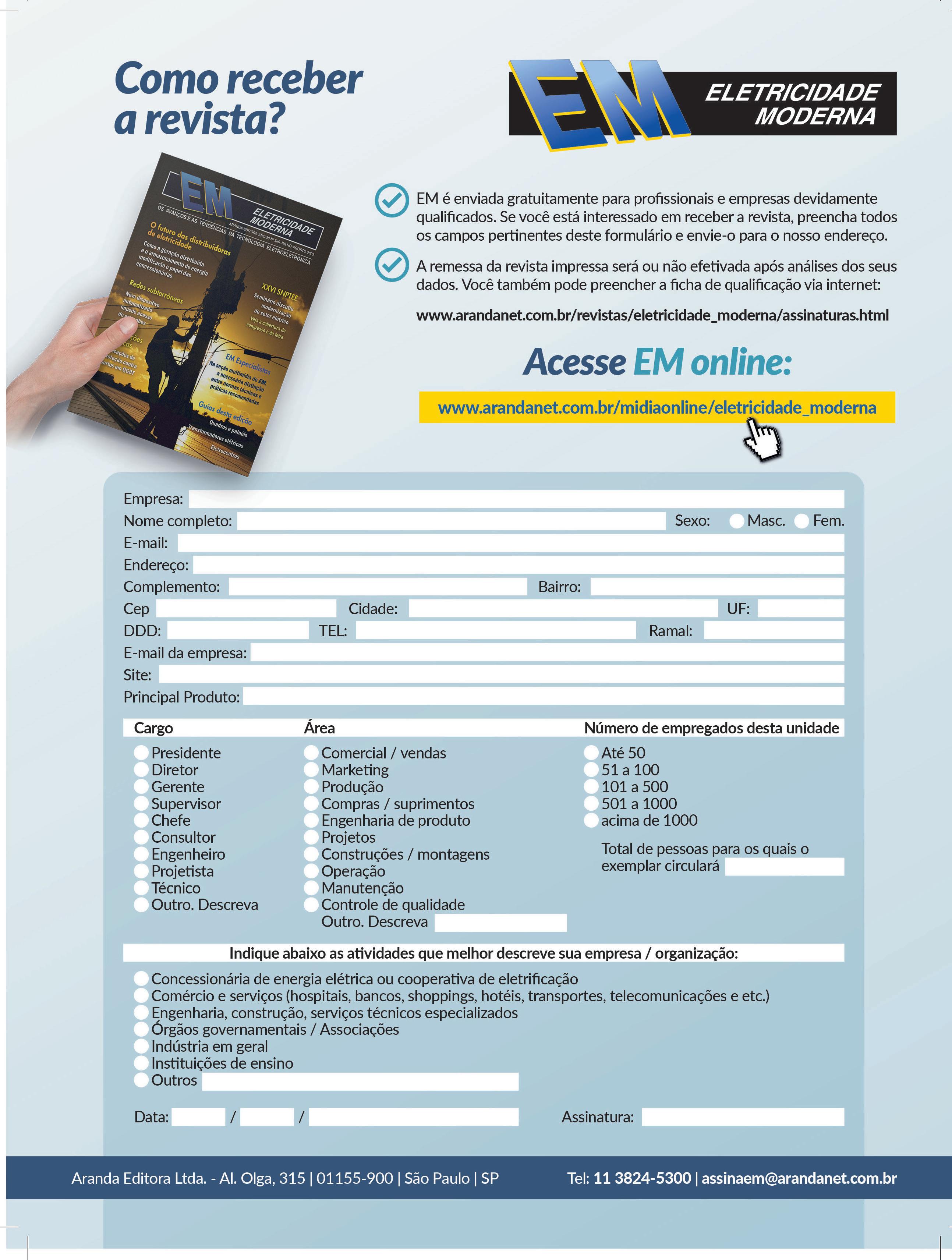 ELETRICIDADE MODERNA , revista brasileira de eletricidade e eletrônica, é uma publicação mensal da Aranda Editora Técnica e Cultural Ltda. Redação, publicidade, administração e correspondência: Alameda Olga, 315; 01155-900 São Paulo, SP - Brasil. TEL. + 55 (11) 3824-5300 em@arandaeditora.com.br | www.arandaeditora.com.br