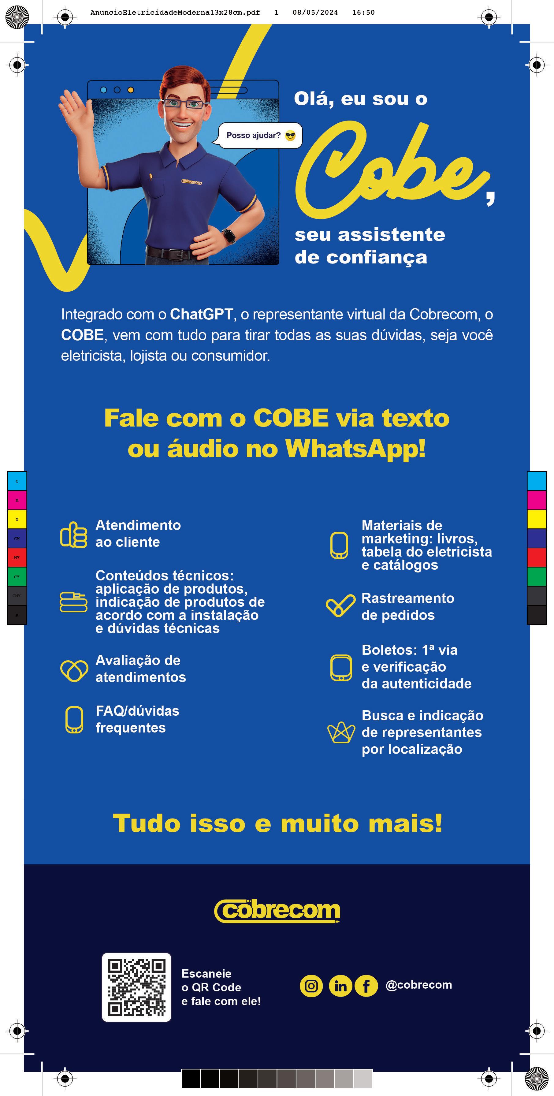 videocast, os episódios terão como convidados especialistas nas áreas dos temas escolhidos. A apresentação fica por conta de João Riva e serão publicados no YouTube e Spotify da Cobrecom. Os podcasts serão mensais, com conteúdo voltado a engenheiros e eletricistas, até estudantes do setor, especificadores e vendedores das lojas de materiais elétricos e de construção. Também serão abordados assuntos da rotina dos trabalhadores, como finanças, utilização de tecnologias na carreira e no dia a dia de trabalho, atendimento, entre outros. www.cobrecom.com.br