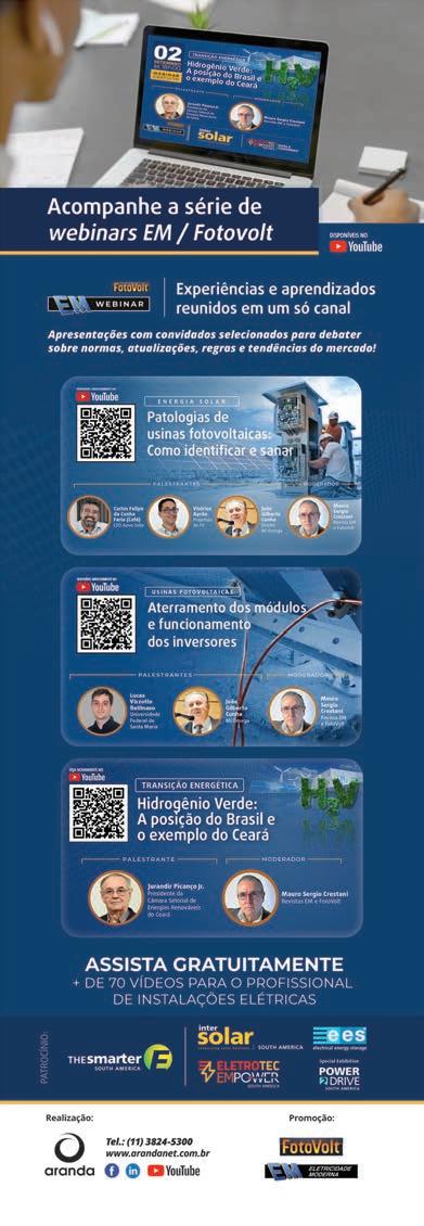 EnãosóeventoscomamarcaIntersolarsemultiplicam.Maisemaissurgemencontrospromovidosporempresasouentidadesdiversas,decarátermaisgeraloumais específico,dedicadosaaspectosdaeconomia,datécnicaoudalegislaçãosetoriais,ou voltadosasubuniversoscomoinstaladores,projetistas,especificadores,financiadores... Eissosemcontaroschamadoseventos online,umfenômenoquevicejoudeformaimpressionantenoisolamentoimpostopelapandemiadeCovid-19.Comoretornodas atividadespresenciais,transformaram-se,algunsmigrandoparaformatoshíbridose muitossimplesmentedesaparecendo.Sobraramosmelhores,osmaisbemembasados eentreestes,semfalsamodéstia,mencionamosaquios EM/FotoVoltWebinars, realizados pelasnossasrevistas FotoVolt e EletricidadeModerna,quejávãochegandoa80edições, todasdisponíveisgratuitamente online.Nestemomento,aliás,estásendorealizadauma sériesobreenergiasolarfotovoltaica,comaevoluçãodasnormaseintegraçãocomcarregamentoveicular,aqualconvidamososleitoresaacompanharemwww.youtube.com/ c/ArandaEventos.