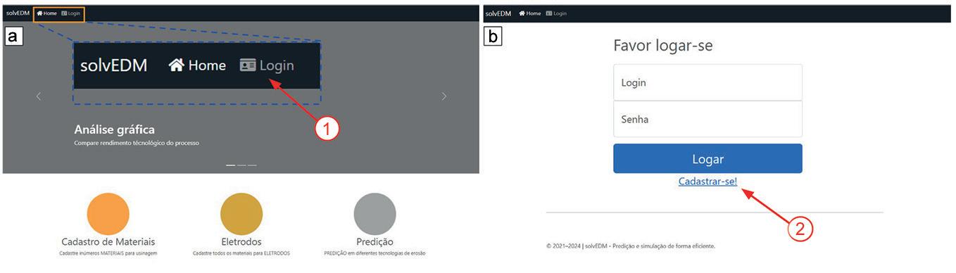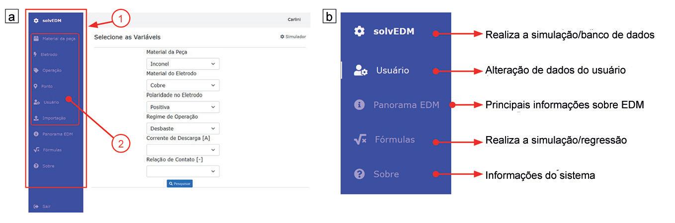 sistema. O acesso para as ações está posicionado à esquerda, no destaque indicado pelo número 1. O administrador pode inserir ou alterar informações do banco de dados (região identificada no destaque 2). Além disso, é possível realizar o cadastramento de novos materiais para a fabricação de componentes, novos materiais para eletrodo, tipo de operação conforme a intensidade da energia de descarga We, alterações na forma de interação gráfica da simulação e importação de novos dados pré-processados para alimentação do banco de dados. O usuário possui acesso indicado na figura 2(b), em que cada um dos ícones de ações está brevemente identificado. No campo “solvEDM” são realizadas todas as simulações cadastradas no banco de dados. Com o preenchimento das variáveis de entrada, as respostas do rendimento do processo são mostradas em formato gráfico. No campo “usuário”, são realizadas as alterações ou atualizações do primeiro cadastro realizado. No campo “panorama EDM”, as principais informações tecnológicas, variáveis do processo e métodos para o dimensionamento do rendimento do processo são descritos.