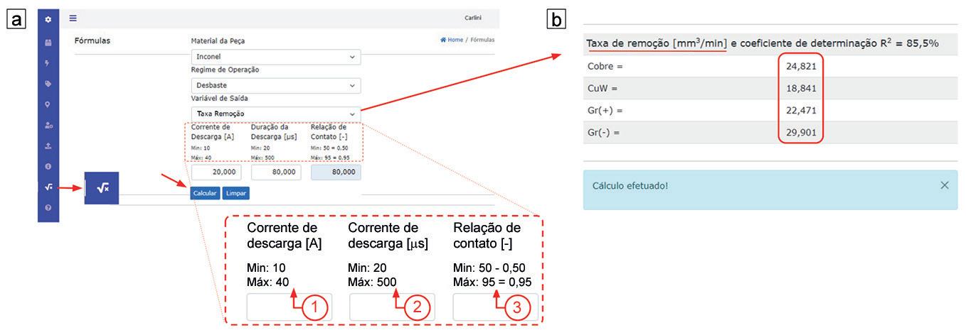 seleção das variáveis independentes de entrada para processamento. A etapa inicial consiste na inserção de lista suspensa para a seleção do material da peça, regime de operação e da variável de saída em que o usuário deseja simular. Adicionalmente, apresentadas no destaque, são inseridas as grandezas da variável e estas necessitam estar dentro de um limite mínimo e máximo estipulados para: 1 corrente de descarga ī e (A); 2 duração da descarga te (µs); e 3 relação de contato τ