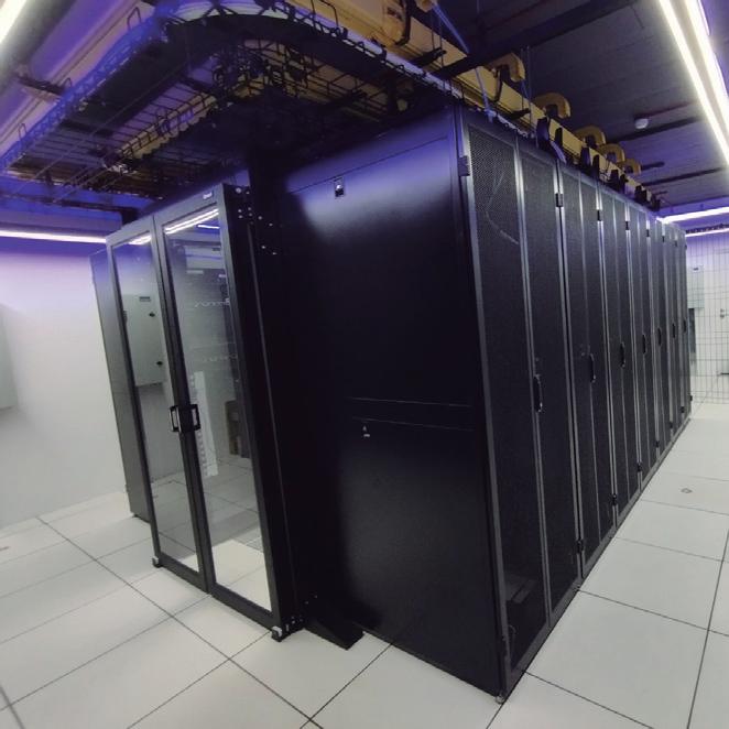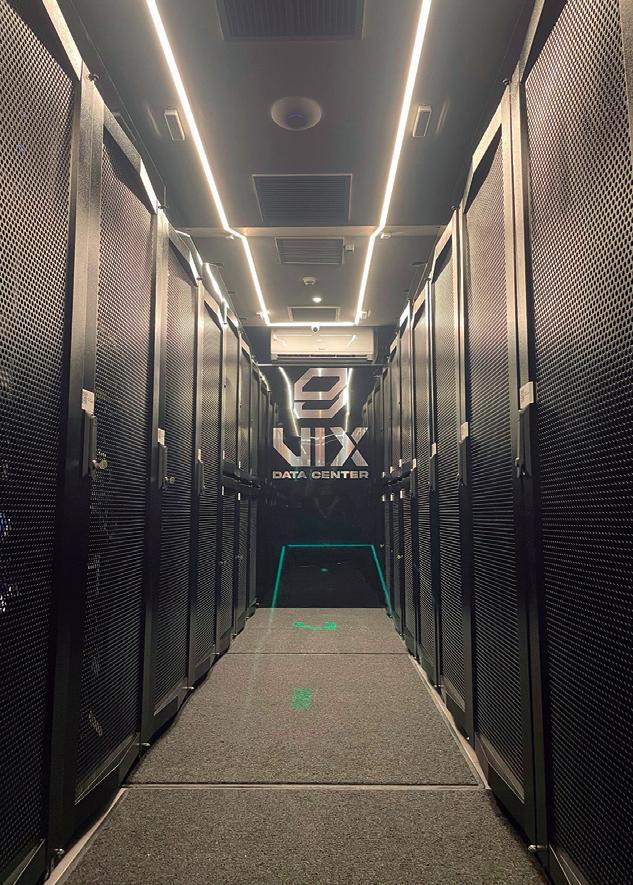 conseguimos colocar o data center em funcionamento. Se fosse construído do zero, levaria no mínimo 180 dias. Na obra convencional em alvenaria, é preciso primeiro construir toda a infraestrutura local antes de montar os sistemas internos, como de incêndio, energia e refrigeração. Na solução modular, tudo é feito na fábrica, de forma mais rápida e econômica, otimizando mão de obra, implementação e escala”, afirma. Com a necessidade mínima de preparação, torna-se uma opção ‘pay as you grow’, reduzindo o Capex. Os módulos medem 3 m de largura por 3,25 m de altura, com comprimento de até 15 m. Para expansões, basta acoplar os módulos. Uma solução completa de 3 x 12 m pode abrigar 10 racks com até 90 kW de carga de TI, 2 UPS, quadros elétricos e máquinas de arcondicionado, incluindo as condensadoras e evaporadoras.