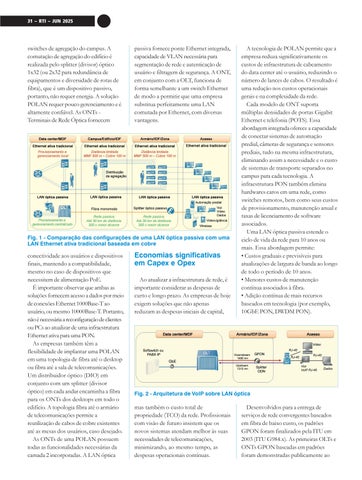 conectividade aos usuários e dispositivos finais, mantendo a compatibilidade, mesmo no caso de dispositivos que necessitem de alimentação PoE. É importante observar que ambas as soluções fornecem acesso a dados por meio de conexões Ethernet 1000Base-T ao usuário, ou mesmo 10000Base-T. Portanto, não é necessária a reconfiguração de clientes ou PCs ao atualizar de uma infraestrutura Ethernet ativa para uma PON. As empresas também têm a flexibilidade de implantar uma POLAN em uma topologia de fibra até o desktop ou fibra até a sala de telecomunicações. Um distribuidor óptico (DIO) em conjunto com um splitter (divisor óptico) em cada andar encaminha a fibra para os ONTs dos desktops em todo o edifício. A topologia fibra até o armário de telecomunicações permite a reutilização de cabos de cobre existentes até as mesas dos usuários, caso desejado. As ONTs de uma POLAN possuem todas as funcionalidades necessárias da camada 2 incorporadas. A LAN óptica