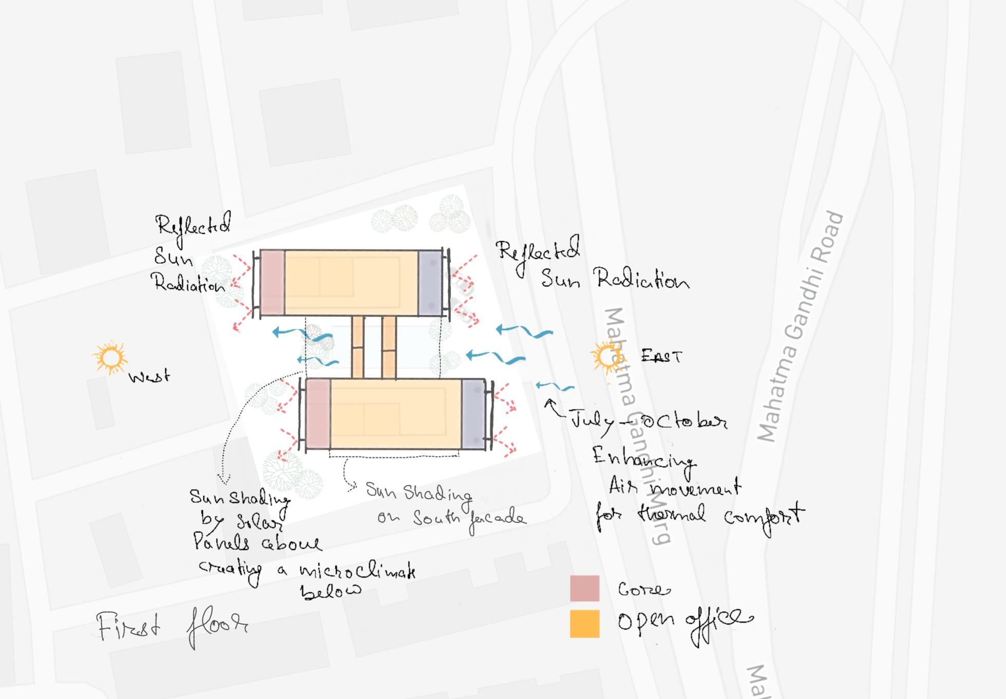 The shaded courtyard space in between the masses helps a create a microclimate. The shallow waterbody in the center helps in evaporative cooling and channelize East west winds in the month July-October when the humidity is high.