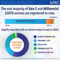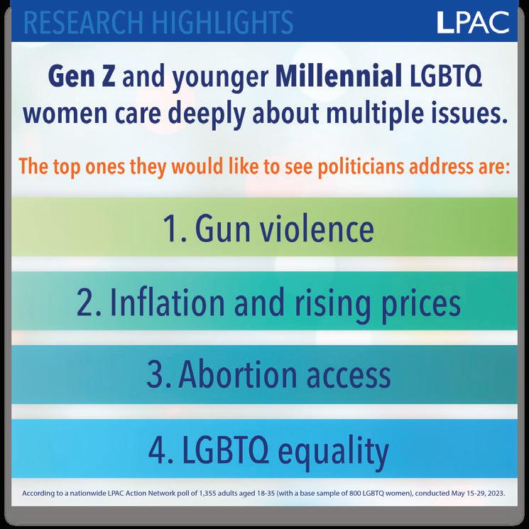 Lisa Turner is the Executive Director of LPAC, the premier national committee supporting LGBTQ+ women candidates running for political office. Prior to becoming the Executive Director, she was the National Political Director. In this role, she created LPAC’s awardwinning IE operation which helped elect U.S. Senators Tammy Baldwin and Kyrsten Sinema, as well as Chicago Mayor Lori Lightfoot. Turner worked on the launch of the committee’s non-profit arm Project LPAC, which has produced groundbreaking data on LGBTQ+ women’s civic engagement and electoral participation, as well as research on how supporters of equality can best communicate their support for transgender rights and individuals.