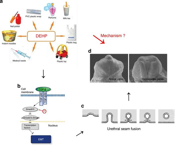 Figure 2. From Zhou et al. 2020: “The mechanism of hypospadias induced by DEHP in rats. The mechanism of hypospadias induced by DEHP was unknown (a → d). DEHP entered the body through various routes (a); gestational DEHP exposure could inhibit urethral EMT mediated by the TGF-β/Smad signal pathway (b); decreased EMT would lead to retardation of urethral seam fusion (c), eventually resulting in the occurrence of hypospadias (d). DEHP diethylhexyl phthalate, EMT epithelial–mesenchymal transition, TGF-β transforming growth factor beta.”