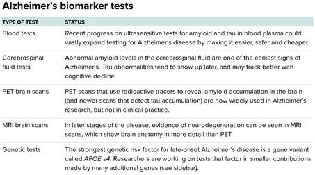 tomography (PET), as well as other biomarkers such as blood tests, cerebrospinal fluid tests, and genetic tests