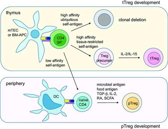 Figure 2. Schematic diagram of Treg cell development tTreg cells develop in the thymus by two-step process First, highaffinity tissuerestricted self-antigens presented by medullary thymic epithelial cells (mTECs) or bone-marrow derived antigen-presenting cells (BM-APCs) derive single-positive (SP) T cells into Treg pathway Second, cytokine IL-2 or IL-15 derives the precursor cells into fully committed tTreg cells pTreg cells develop in the periphery by environmental antigens such as microbial antigens or food antigens presented by mucosal tissue-resident dendritic cells (DCs). TGF-β, retinoic acids (RAs) and short chain fatty acids (SCFAs) produced in the immunosuppressive environments promote pTreg development Reprinted from Lee W, Lee GR. Transcriptional regulation and development of regulatory T cells Exp Mol Med. 2018 Mar 9;50(3):e456. doi: 10.1038/emm.2017.313. PMID: 29520112; PMCID: PMC5898904.