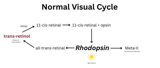 Figure 1. Simplified schematic of the normal visual cycle Vitamin A (trans-retinol) obtained from blood circulation is converted by RPE65 enzyme into 11-cis-retinal. This molecule combines with opsin to form rhodopsin. Upon light stimulation, rhodopsin is activated (Meta-II), causing isomerization of 11-cis-retinal into all-trans-retinal, which is then recycled to sustain the phototransduction cascade