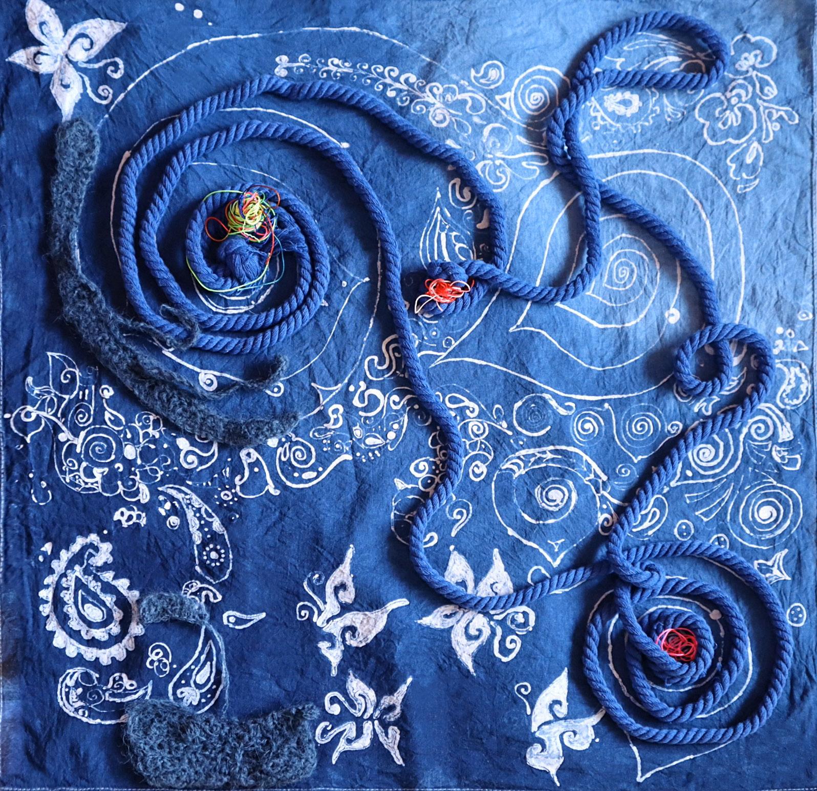 After reading her poetry, I was inspired to create a painting that represents the image she holds in her heart using batik, while also expressing what I felt from her words through the forms of wax and yarn. Batik involves applying melted wax to fabric with a wax tool, followed by dyeing the fabric with indigo. Blue, being one of the primary colors of light and a psychological primary color, symbolizes the sky and represents eternal memory. The wax traces cannot be washed away, much like how forgotten memories leave lasting marks, slowly remaining over time. I incorporated butterfly elements into my work. While there is no definitive research on how long a butterfly's memory lasts, it is likely that their memory is short-lived, Although dementia had short-term memory loss, everything was done more slowly and with more random logic. She learned to live with dementia and came to realize that she was still herself. Additionally, I included swirling shapes to represent the collision of memory whirlpools.