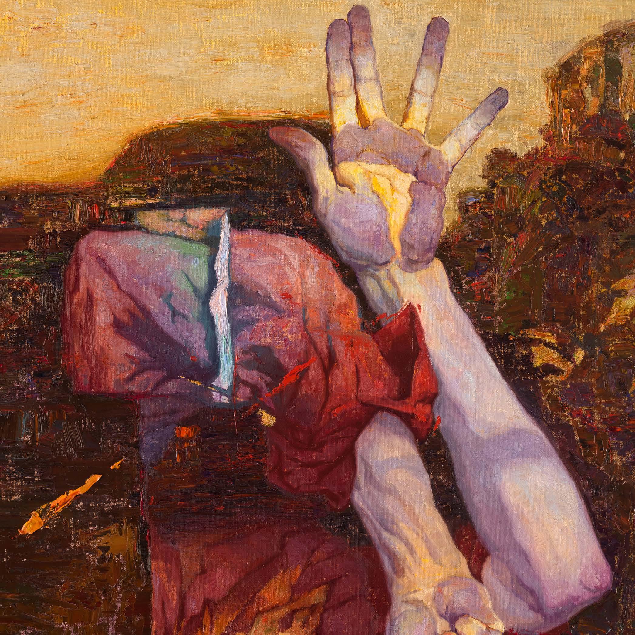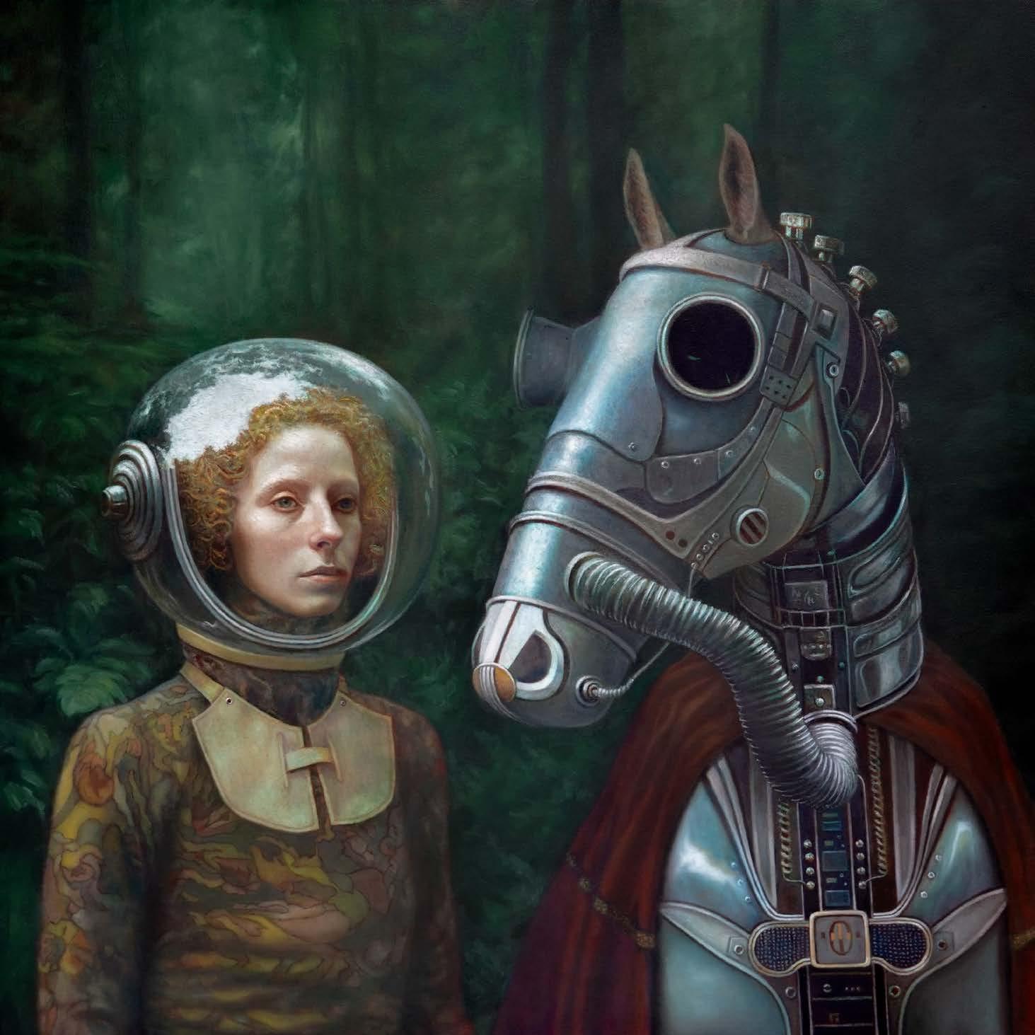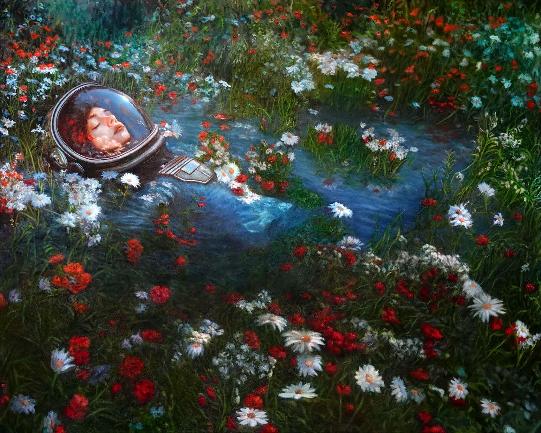 J. Adam McGalliard is a contemporary realist artist who blends traditional oil painting with modern technology to explore identity, myths, and the divides shaping today’s society. His artwork is rich in layers, weaving personal stories with archetypes. Futuristic figures surrounded by natural environments invites the viewer to ponder the intricate dynamics between humanity and nature.
