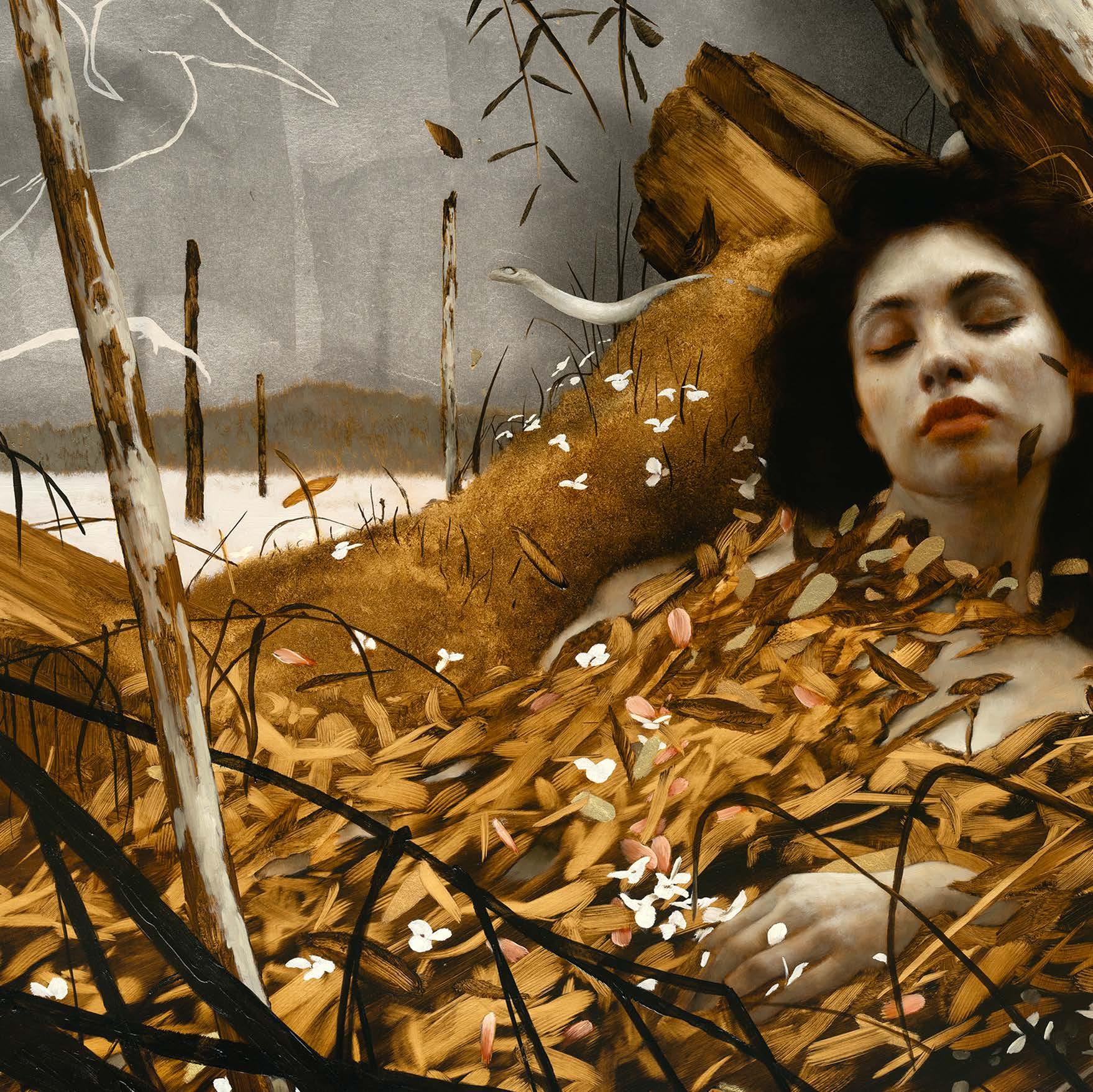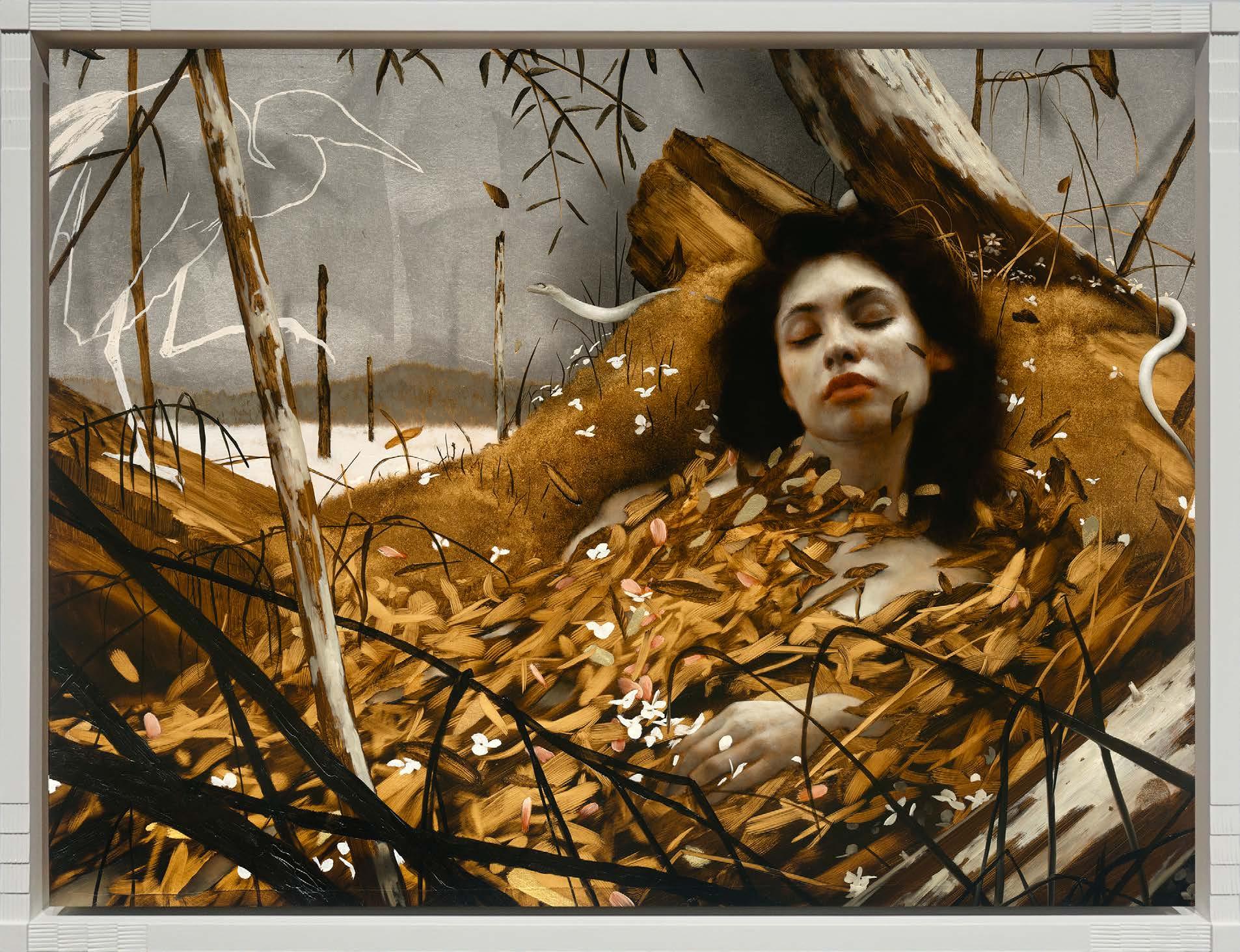 Brad Kunkle has become internationally known for his unique use of gold and silver leaf in contemporary oil painting. His themes explore the shedding of dogmas inherited from previous generations, intuition, and the power of feminine energies as guides for seeking enlightenment in symbiosis with the natural world.