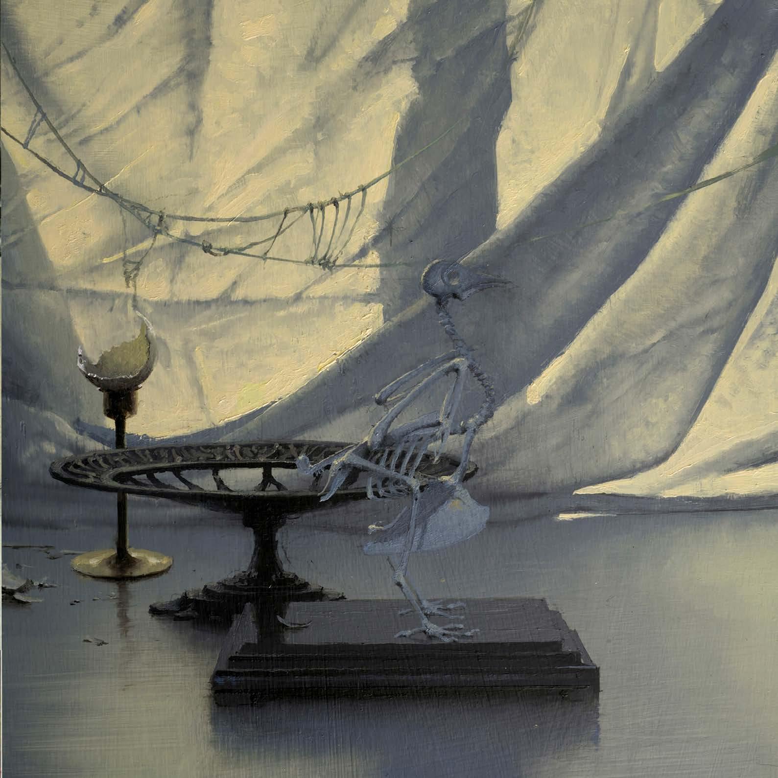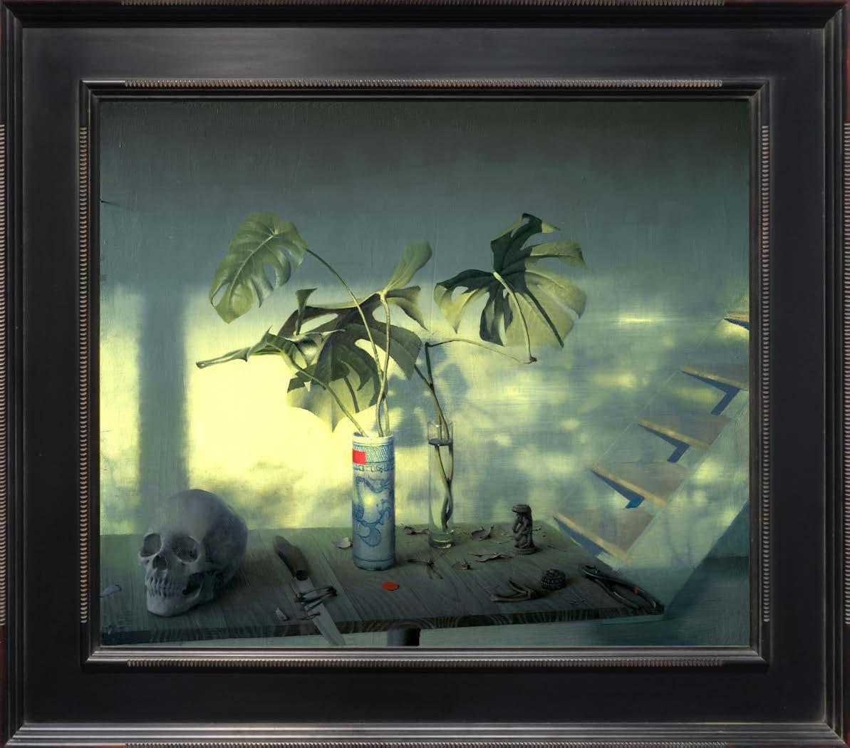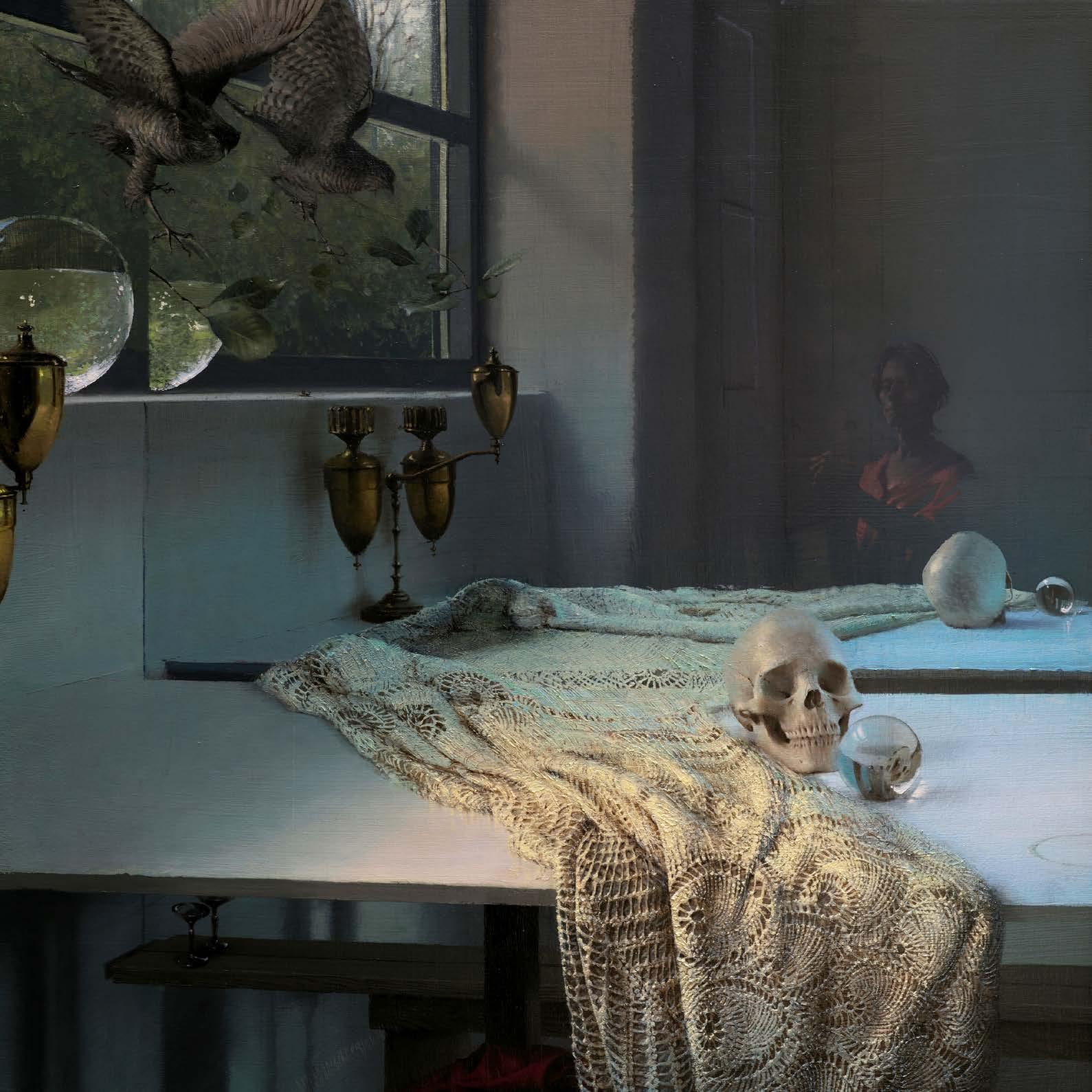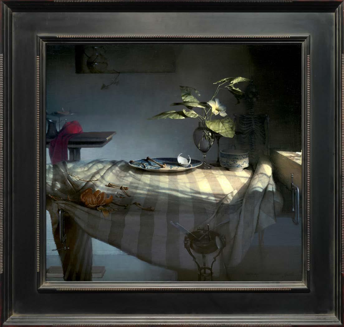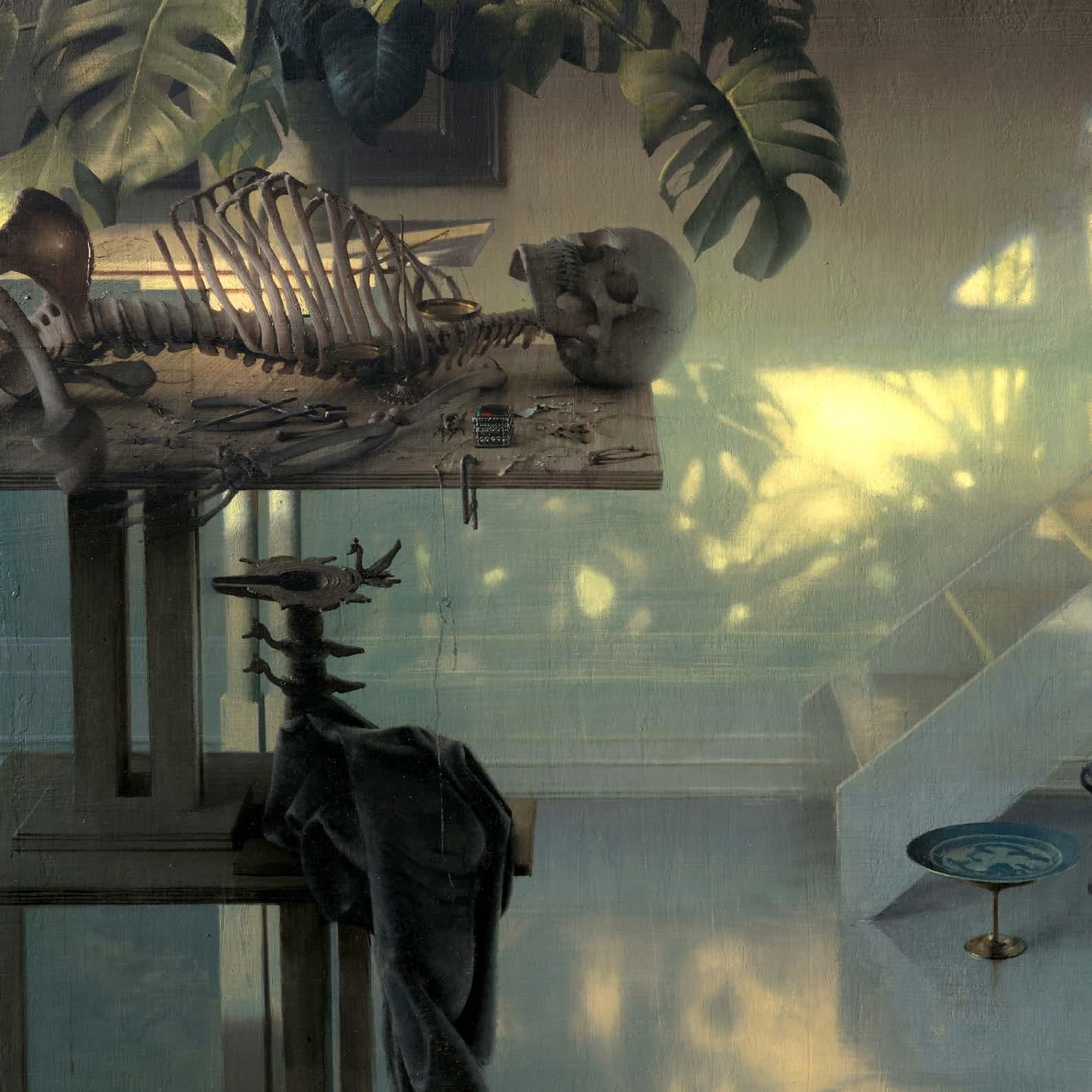 In “What Remains,” Daniel Sprick returns to many of the objects and motifs that have appeared throughout his work for decades; skulls, vessels, flowers, tools, and plants. These familiar forms appear alongside fragile remnants such as broken eggshells, bones, and wilted petals. Together they quietly echo the long tradition of vanitas painting, where objects serve as reflections on time, mortality, and renewal. Some of the objects depicted have accompanied the artist from studio to studio for many years, while others appear only briefly before fading away.