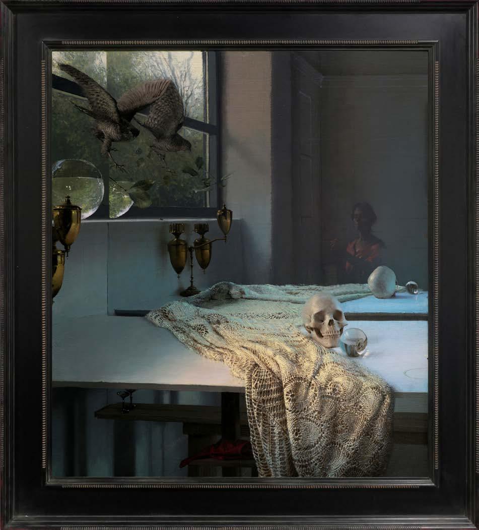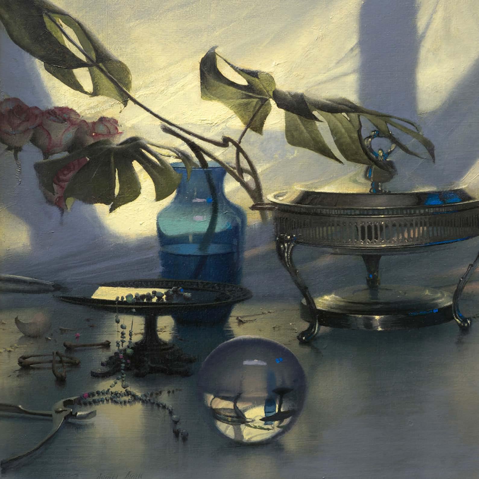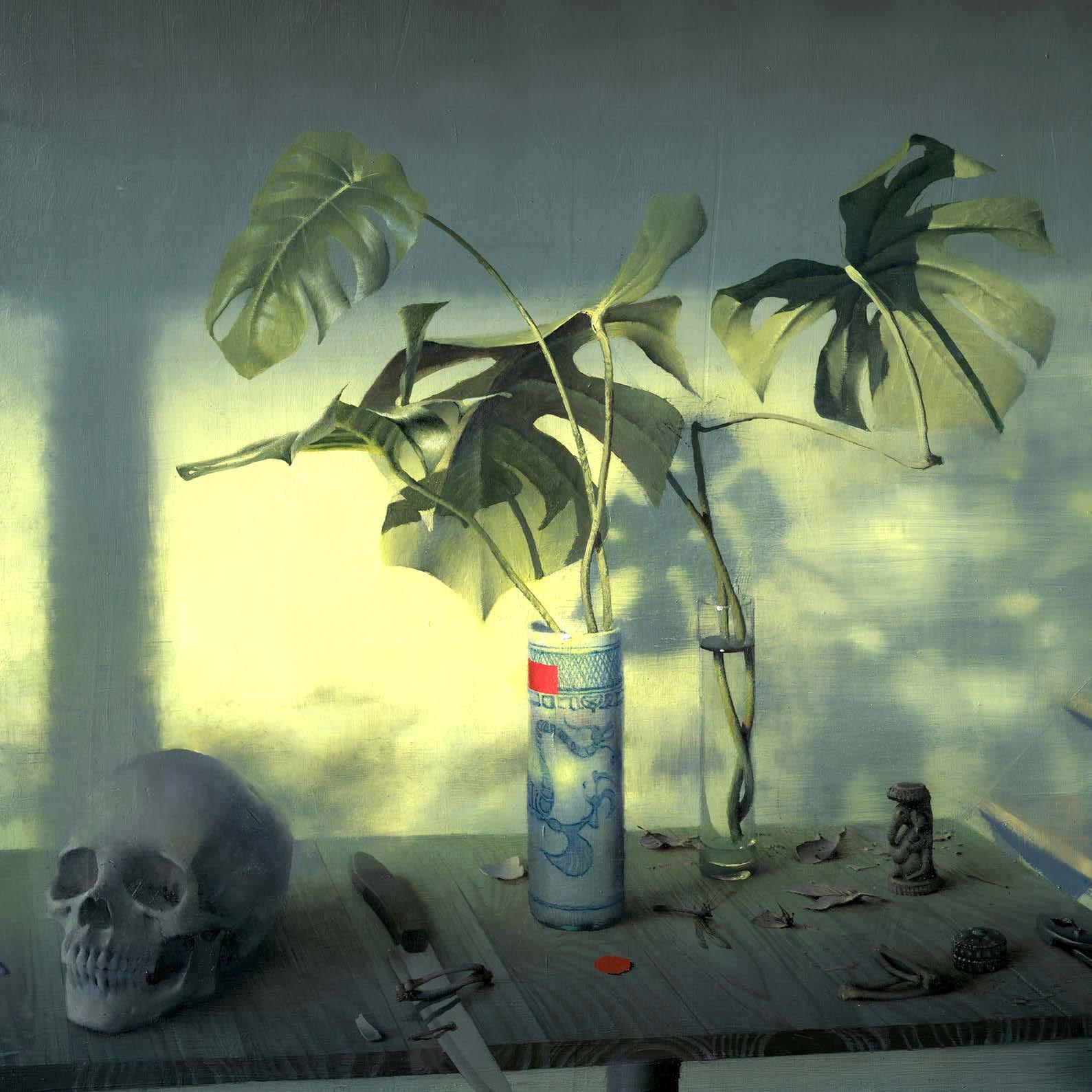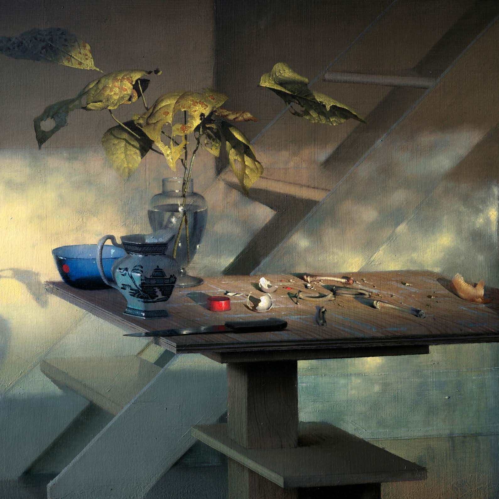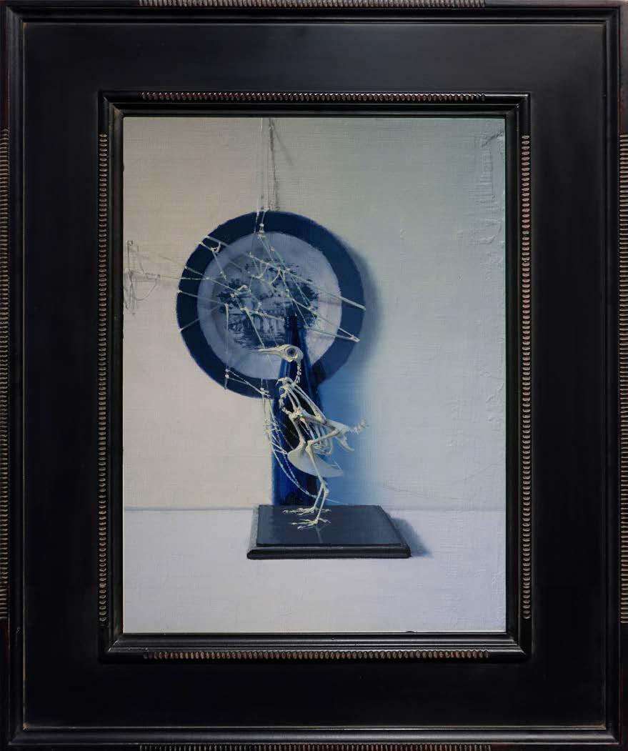 In “What Remains,” Daniel Sprick returns to many of the objects and motifs that have appeared throughout his work for decades; skulls, vessels, flowers, tools, and plants. These familiar forms appear alongside fragile remnants such as broken eggshells, bones, and wilted petals. Together they quietly echo the long tradition of vanitas painting, where objects serve as reflections on time, mortality, and renewal. Some of the objects depicted have accompanied the artist from studio to studio for many years, while others appear only briefly before fading away.