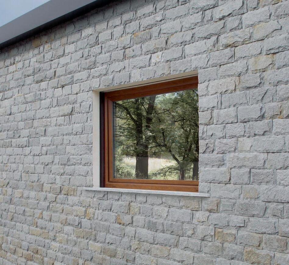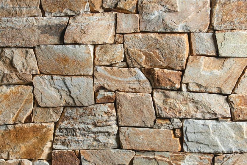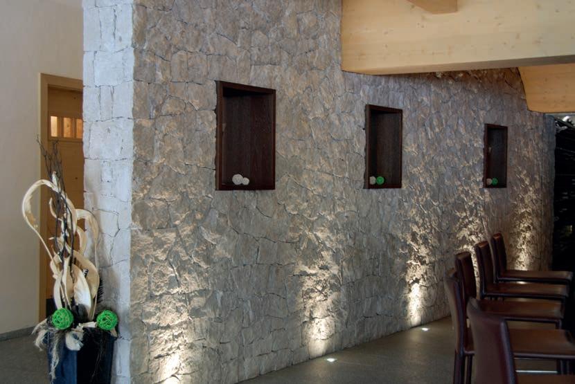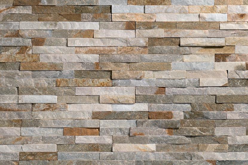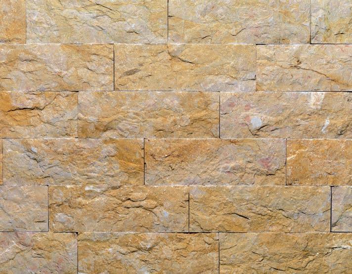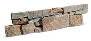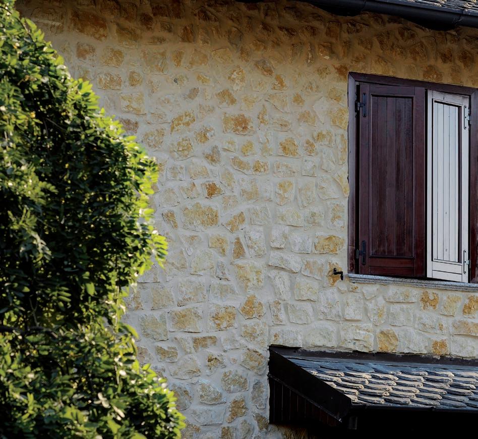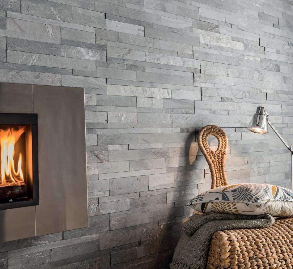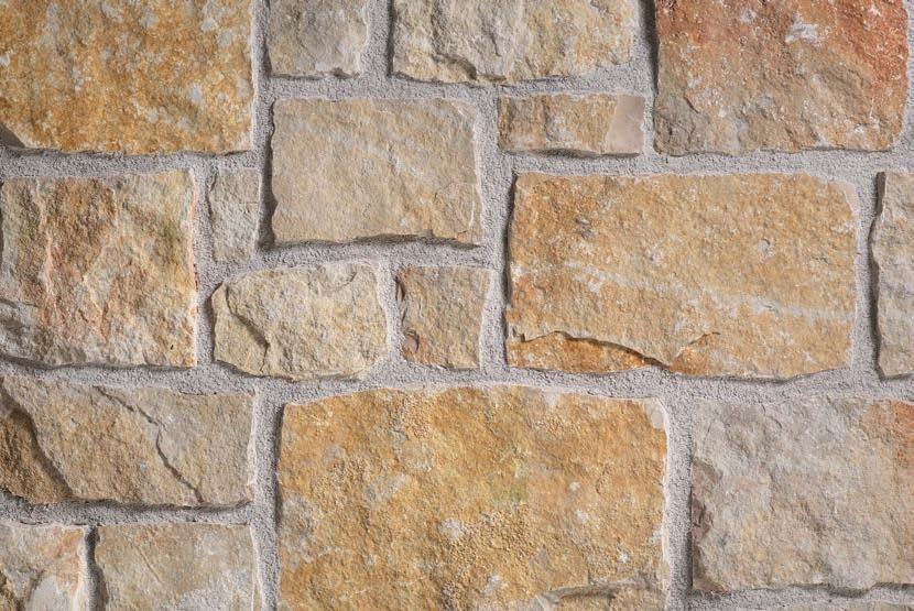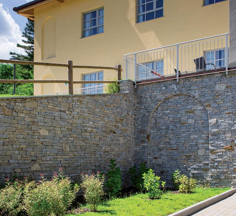 Natural stone was created over thousands of years and therefore it is destined to last forever. Using modern technology, skilful master craftsmen cut the stone blocks into pieces that are 2 or 3 centimetres thick. This way they obtain on one hand the split face and on the other a perfectly flat side, ideal for a quick and precise gluing. Furthermore, the stone weighs less and a smaller space is required to install it. The stones can be placed in the pleasant so-called “random mix” pattern because they come in different shapes and sizes. They can also be laid in a more regular way the so-called “stretcher” pattern. The various kinds of stone can be laid dry or with joints.