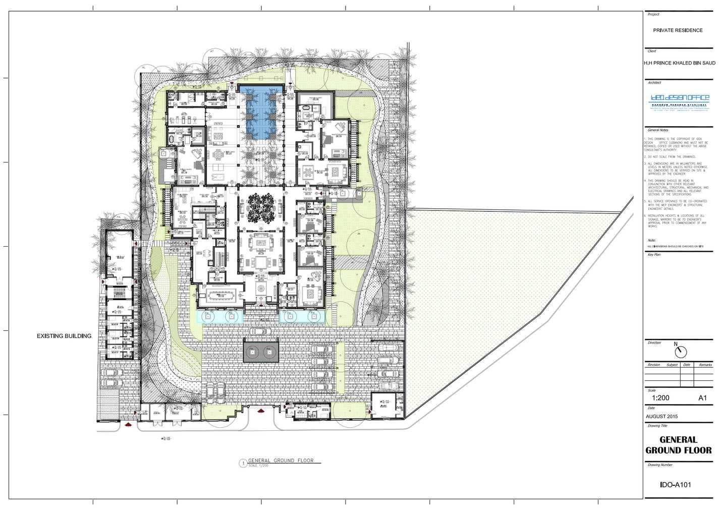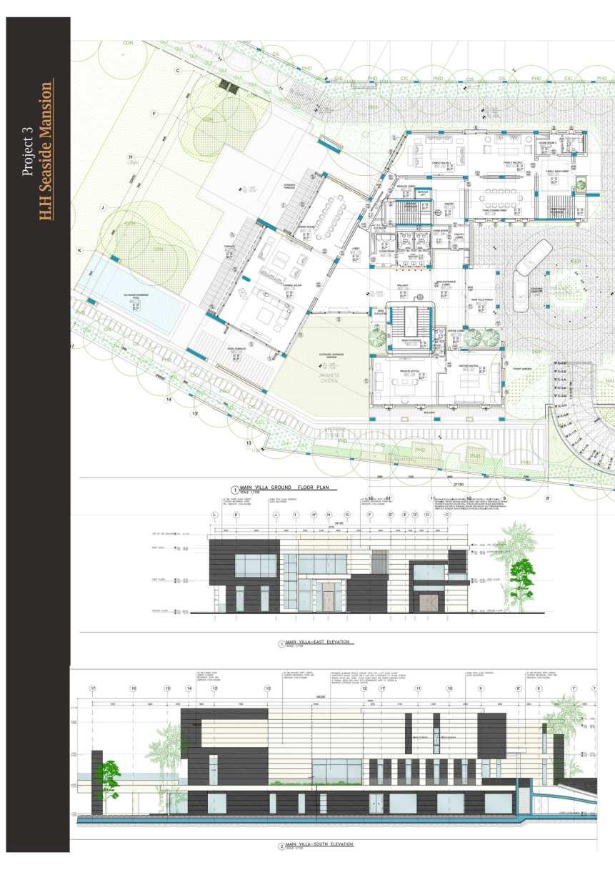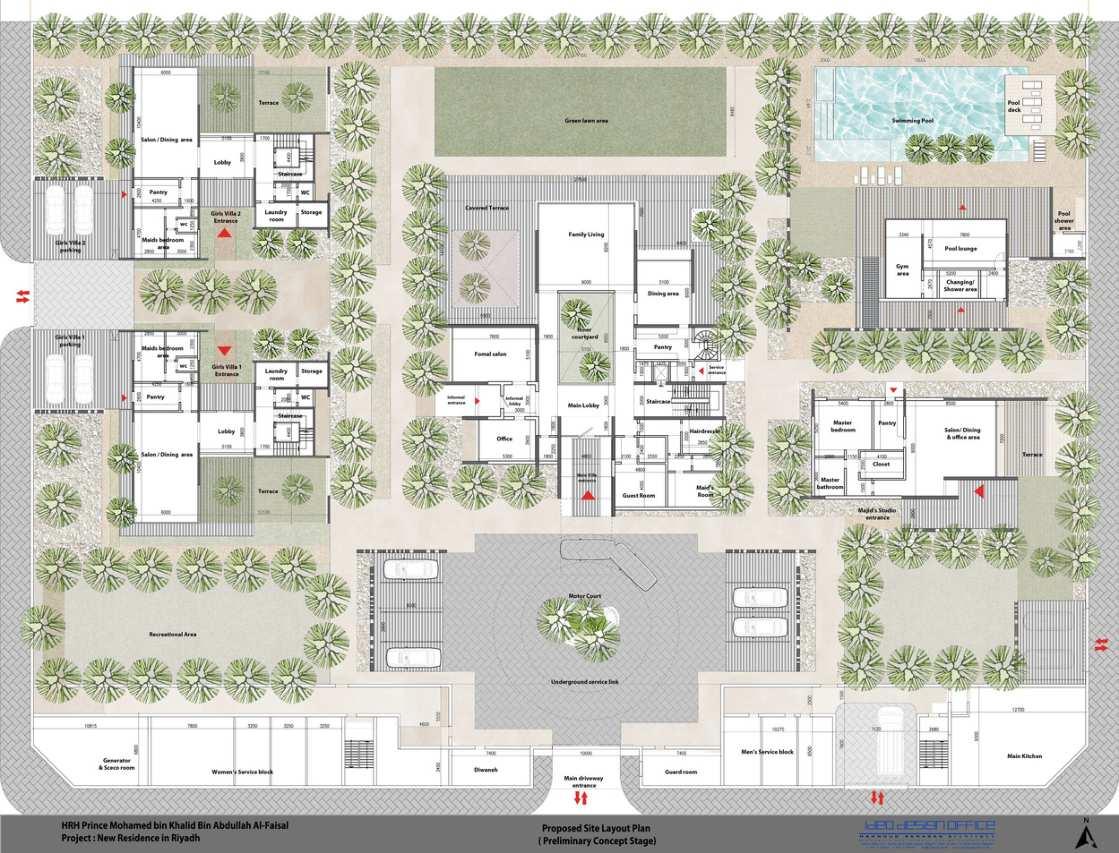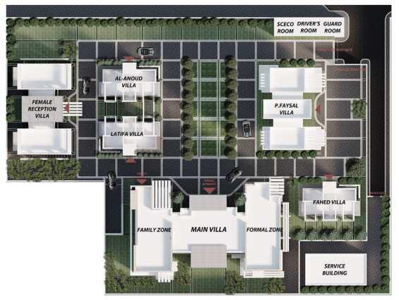 DESIGNED TO MEET THE NEEDS OF A SAUDI FAMILY LOOKING FOR AN ELEGANT DESIGN WITH FULL UTILIZATION OF INTERNAL AND EXTERNAL SPACES, FACILITIES WITH ALL AMENITIES, AND AN ELEGANT LIFESTYLE. THE COMPLEX WAS DESIGN IN UTILIZING THE MAXIMUM BUILT UP AREA WITH THE CONSIDERATION OF PRIVACY FOR EACH VILLA. CLEAR GEOMETRIC LINES WERE USED IN LANDSCAPE, SITE AND MASSING CREATING A COMPLEX OF INTEGRATED MODERN ARCHITECTURE. THE PROPOSED PROJECT CONSISIT OF MAIN FAMILY VILLA WITH A SYMMATRECIAL AXISES, DIVIDING THE SITE VISULALLY WITH THE OTHER FIVE ADJACENT VILLAS, DROP OFF AREAS, ENTRANCES AND SERVICE BUILDING