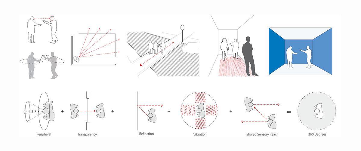 The use of acoustic mirrors on the ceiling or on heightened levels on the walls could be advantage to the signers and a little strain for the non-signers. The mirrors would operate as a mode of reflection for the deaf as they walk through the hallways or any gathering space, making it simpler for them to be aware of any such activity coming from their rear side. At the same time, the acoustic elements represent a medium in which, if one whispers towards these, then the whispers are heard at the far opposite end, where another mirror is placed. In this manner, the hearing lot would be forced to keep themselves from talking or even whispering!