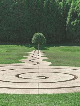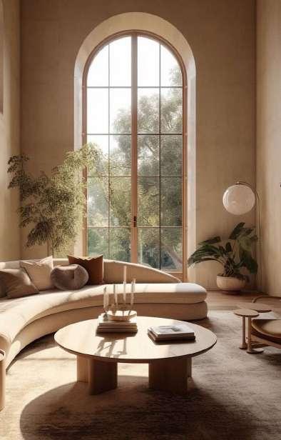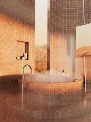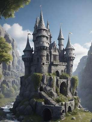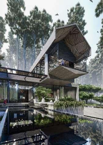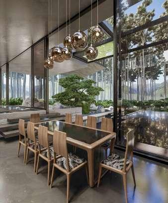 The façade is a masterpiece of contrasts, where the solidity of castle-like forms is softened by expansive glass openings. Massive floorto-ceiling windows and oversized glass doors dissolve the barrier between interior and exterior, allowing natural light to cascade through the space while offering uninterrupted views of the landscape. These transparent planes introduce an element of lightness, ensuring that despite its monumental inspiration, the structure remains inviting, open, and connected to its surroundings.