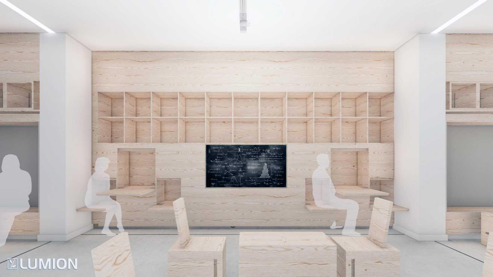 Movable walls contain chairs and by the act of the modularity they are forming tables, benches