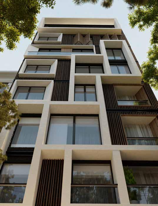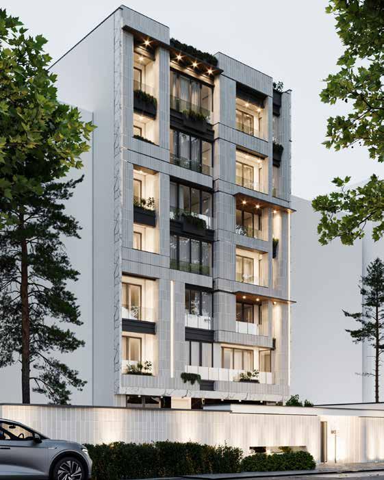 To achieve the desired white aesthetic, we employed a combination of cementitious facade with nano-coating and wood elements. The final layout consisted of a basement floor serving as a parking area, the ground and first floors housing the engineering office at the company’s new location, and eight residential units. Notably, the top two units feature green courtyards that offer panoramic views of Mount Cherkin and Mount Ararat, along with a dedicated recreational and sports zone. The innovative ten-sided slab system was adopted to both capture the picturesque vista and facilitate the creation of elongated openings while eliminating the need for central columns.