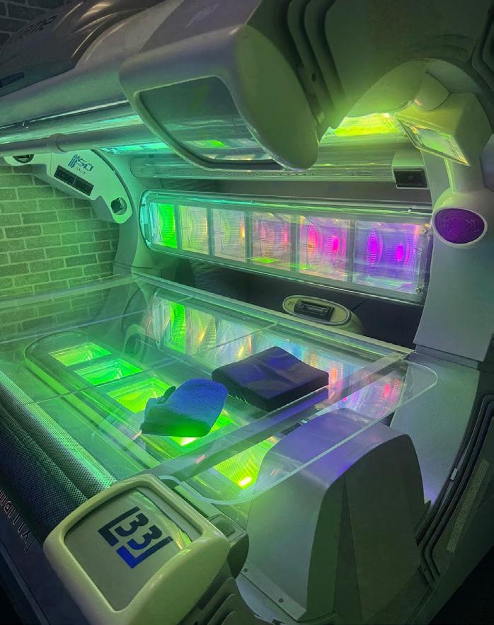 Shown is the inside of a tanning bed without the UV lights on. Hundred of UV lights are blasted at your skin for upwards of 12 minutes at high levels.