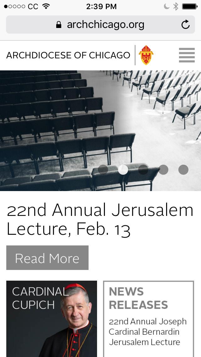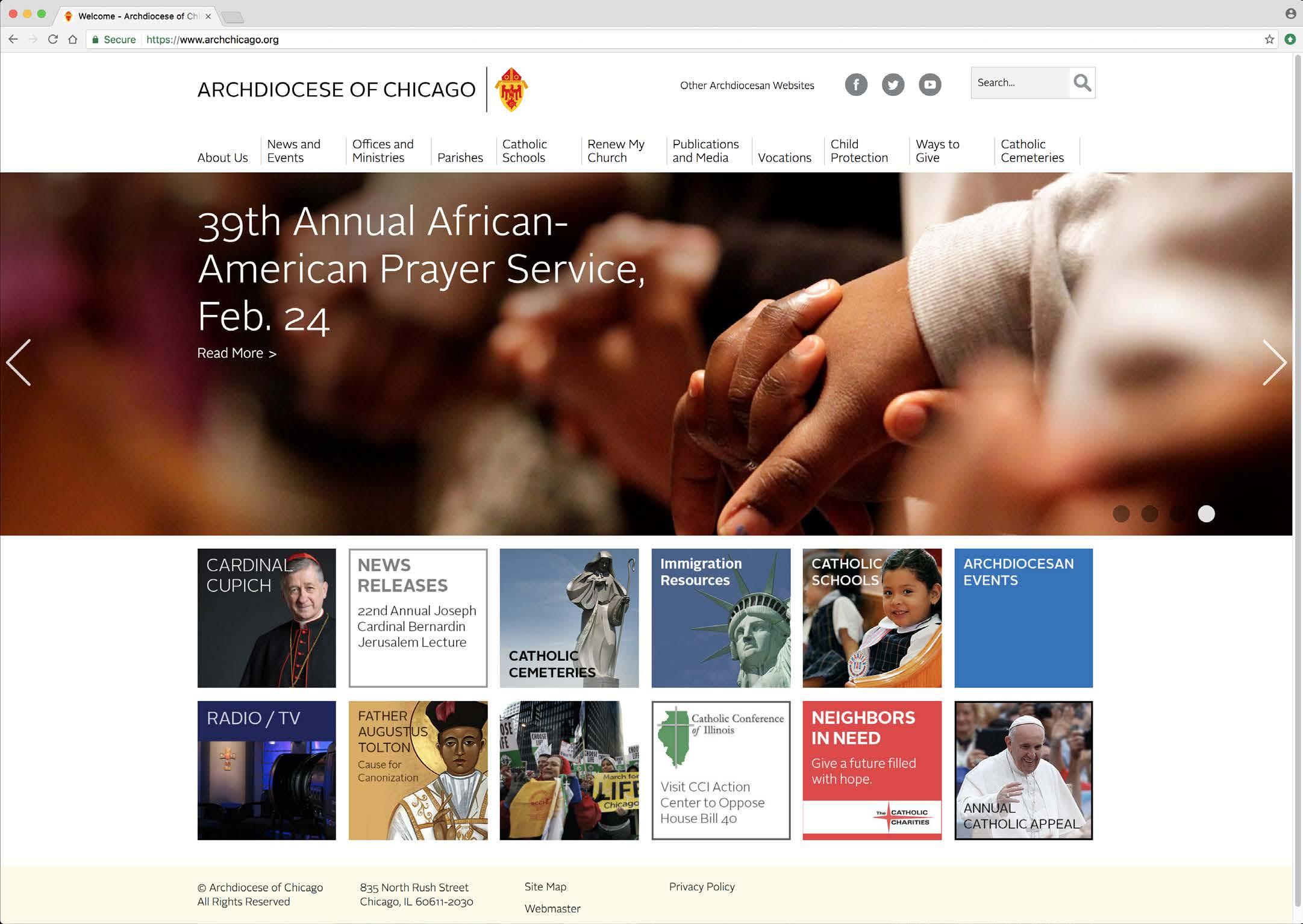 The primary website of the archdiocese, archchicago.org, has been designed to reflect the clean, contemporary, accessible style of the identity. With large images and clear navigation, users experience a more cohesive website with the same depth of information they’ve grown used to, but presented in a more aesthetically pleasing way.