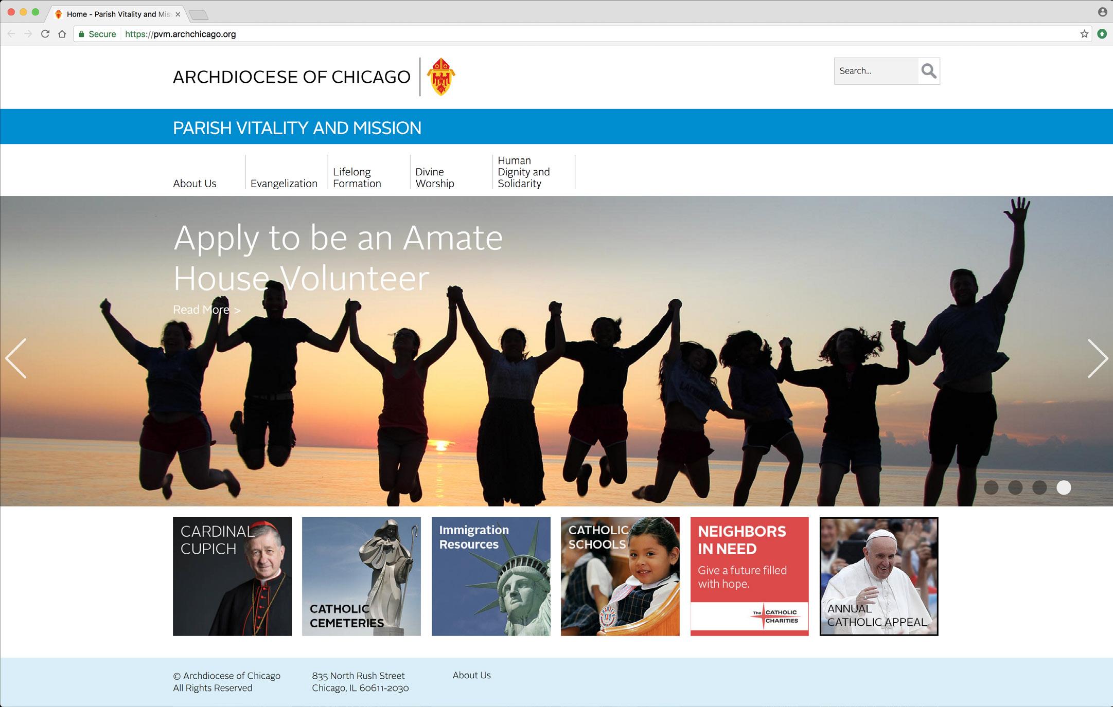 Subsites such as those for Catholic Schools; Parish Vitality and Mission; and others are designed on the same platform and with the same grid as archchicago.org, but with the added sub-identification of a colored band that contains the entity name.