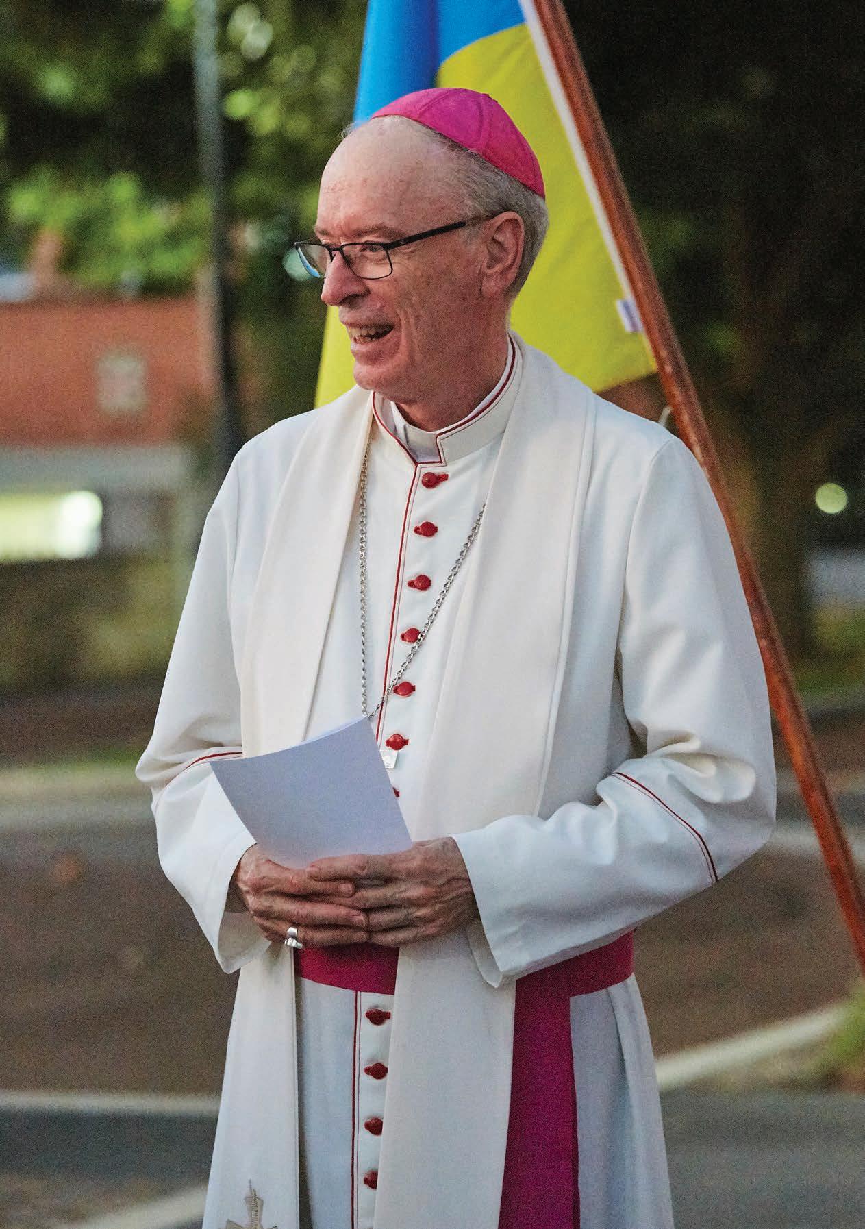 Auxiliary Bishop Donald Sproxton speaks with guests at the ecumenical prayer service on the anniversary of the war in Urkaine on Friday, 24 February 2023. Photo: Ron Tan.