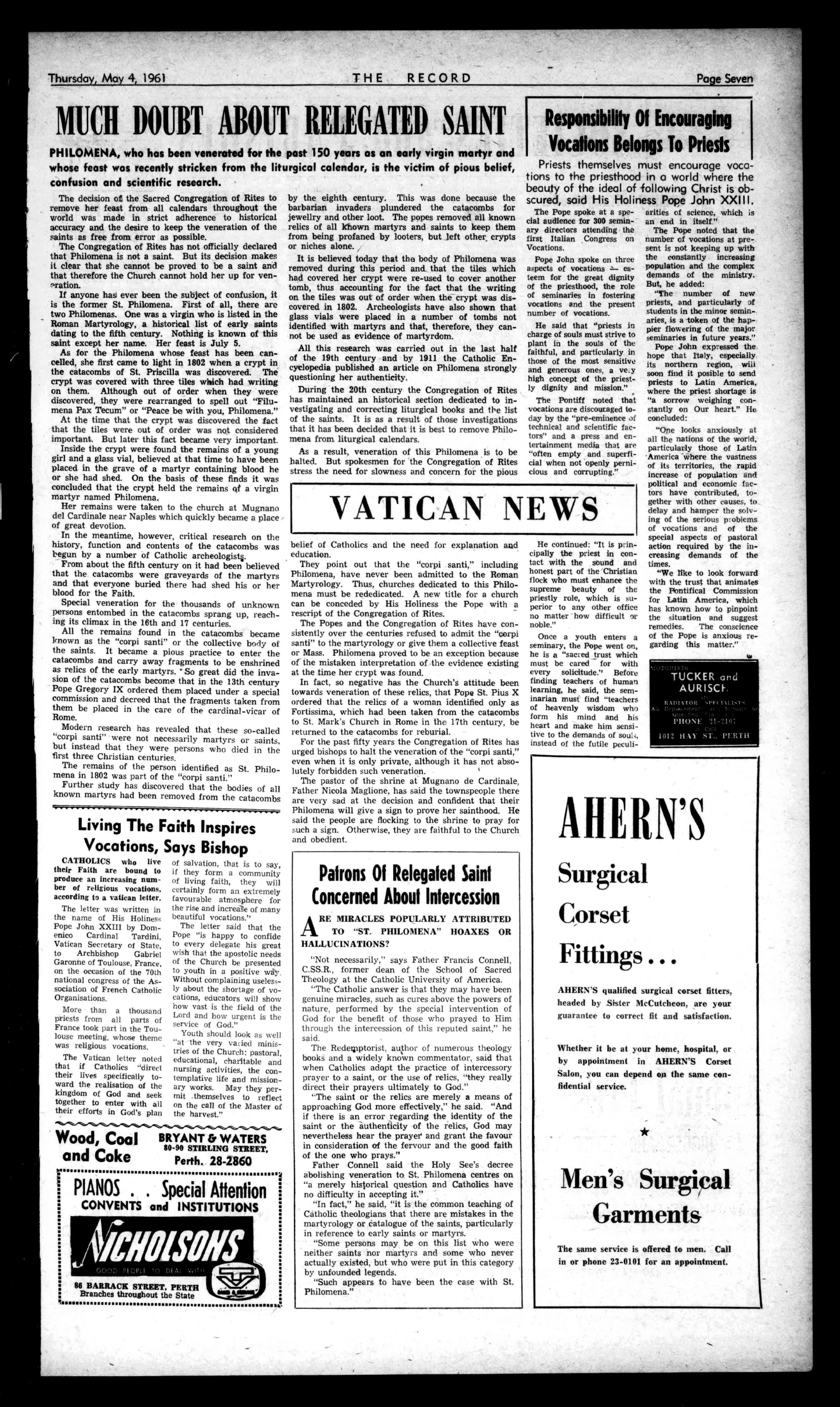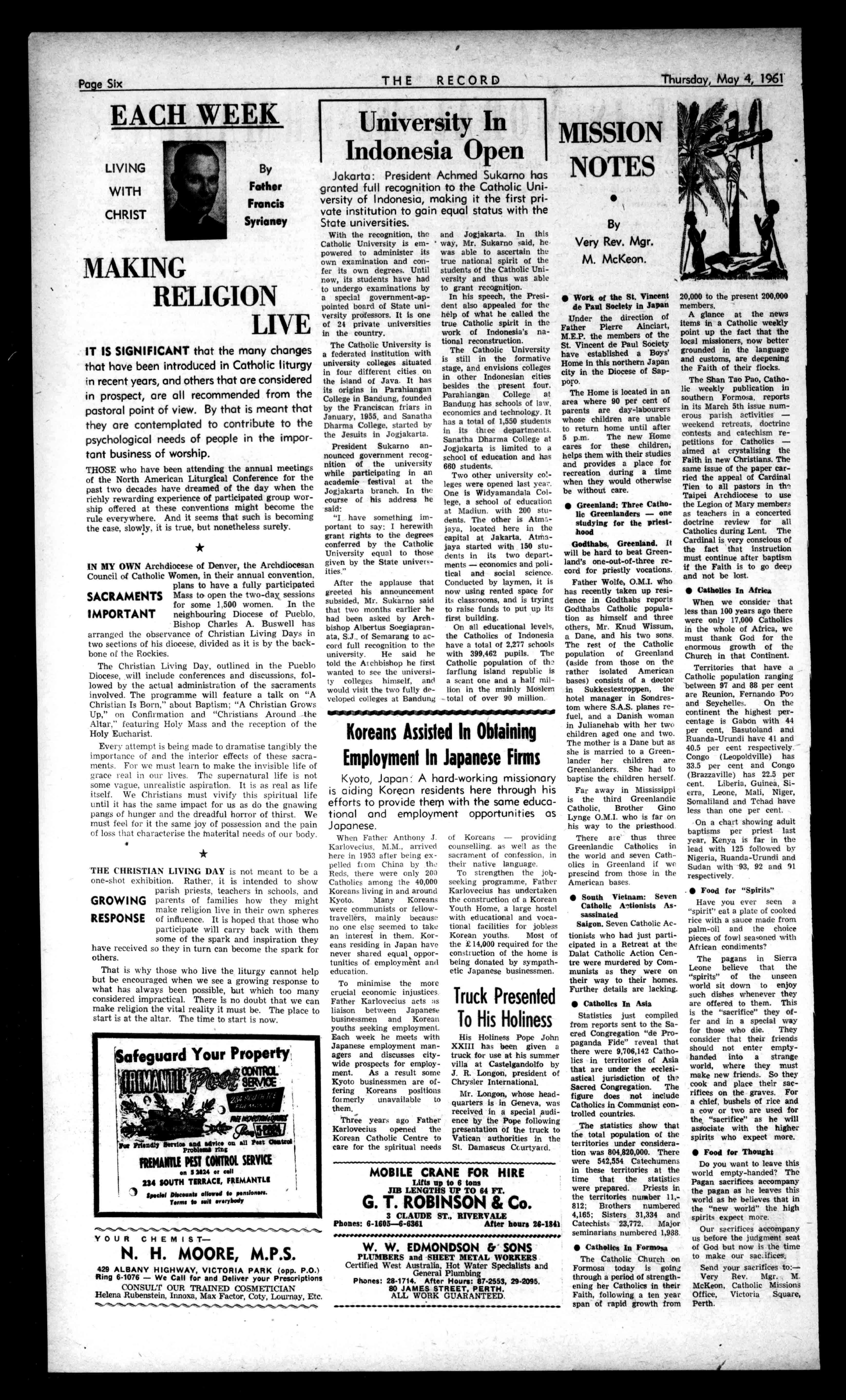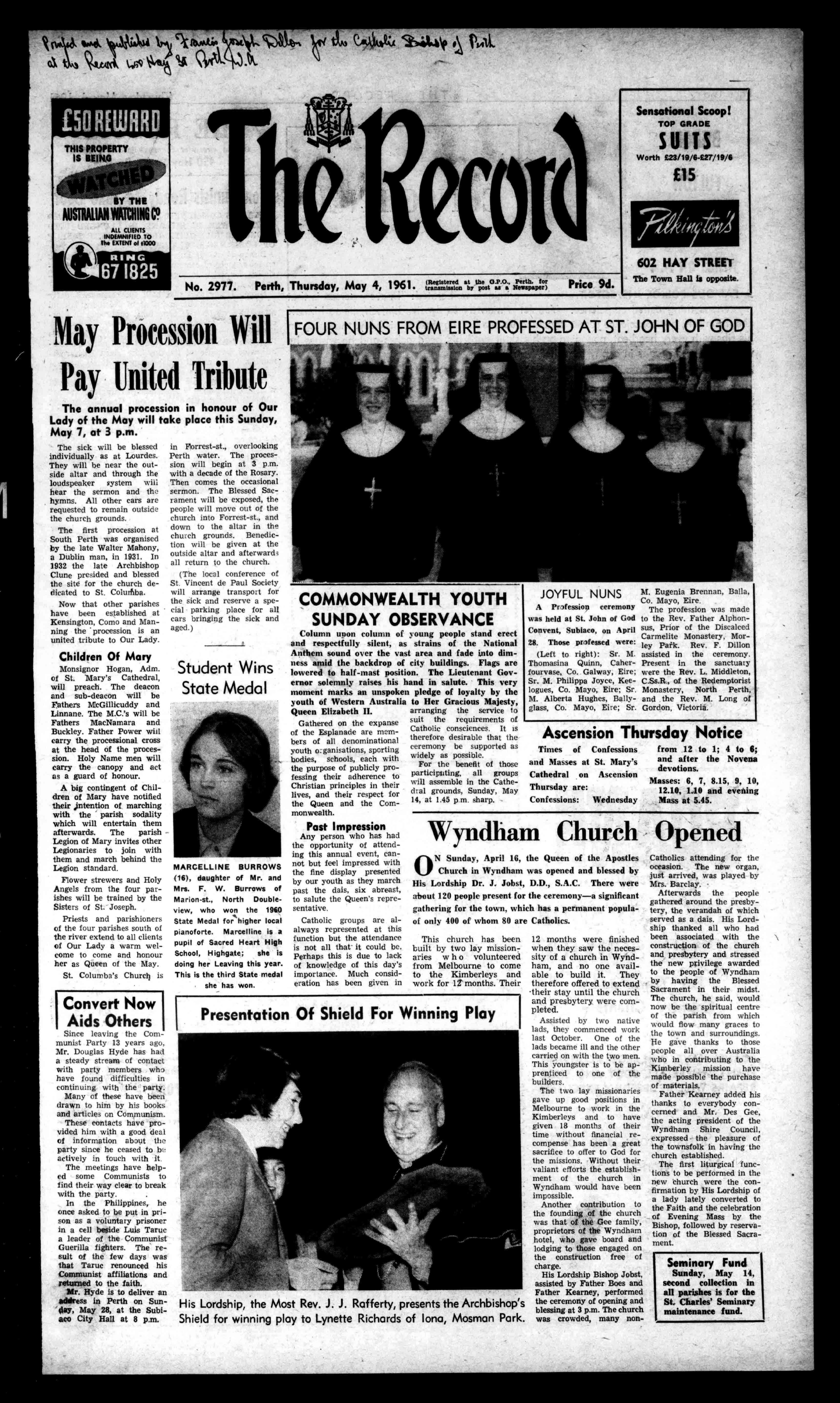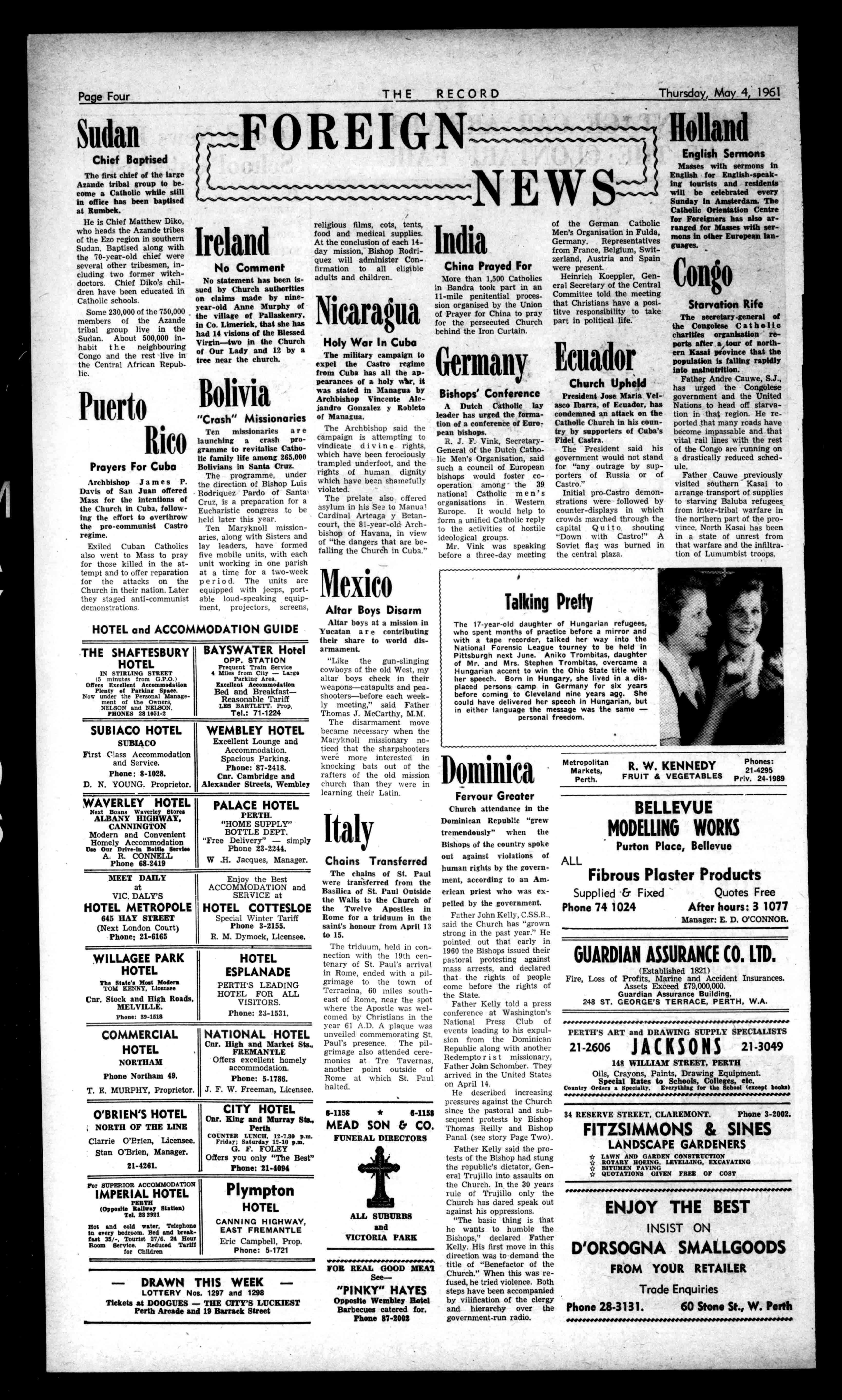 7.30p.m.:Confirmation .andCanonicalVisitation, MorleyPark. June18: 3.30p.m.Confirmationand CanonicalVisitationLeederville. MEMORIALS G.C.SMITH&Co. 75QUEENVICTORIASTREET,FREMANTLE. SpecialisinginAltarsandMemorialWork. ErectedanywhereinW.A. ChurchAltarsplannedandexecuted. DesignsandQuoteswithoutobligation. Wehaveover60Years'Experience. PHONE5-1661 Thursday,May4,1961 THERECORD OffidalOrganoftheArehdloseseofl'erik. 450HayStreet,Perth CommunistsReadyToTakeOver IRELAND'SCOMMUNISTPARTIESAREREADYTO SEIZEPOWERIFIRELANDISPLUNGEDINTO ECONOMICORPOLITICALCHAOS,THEBISHOP OFCORKHASDECLARED.