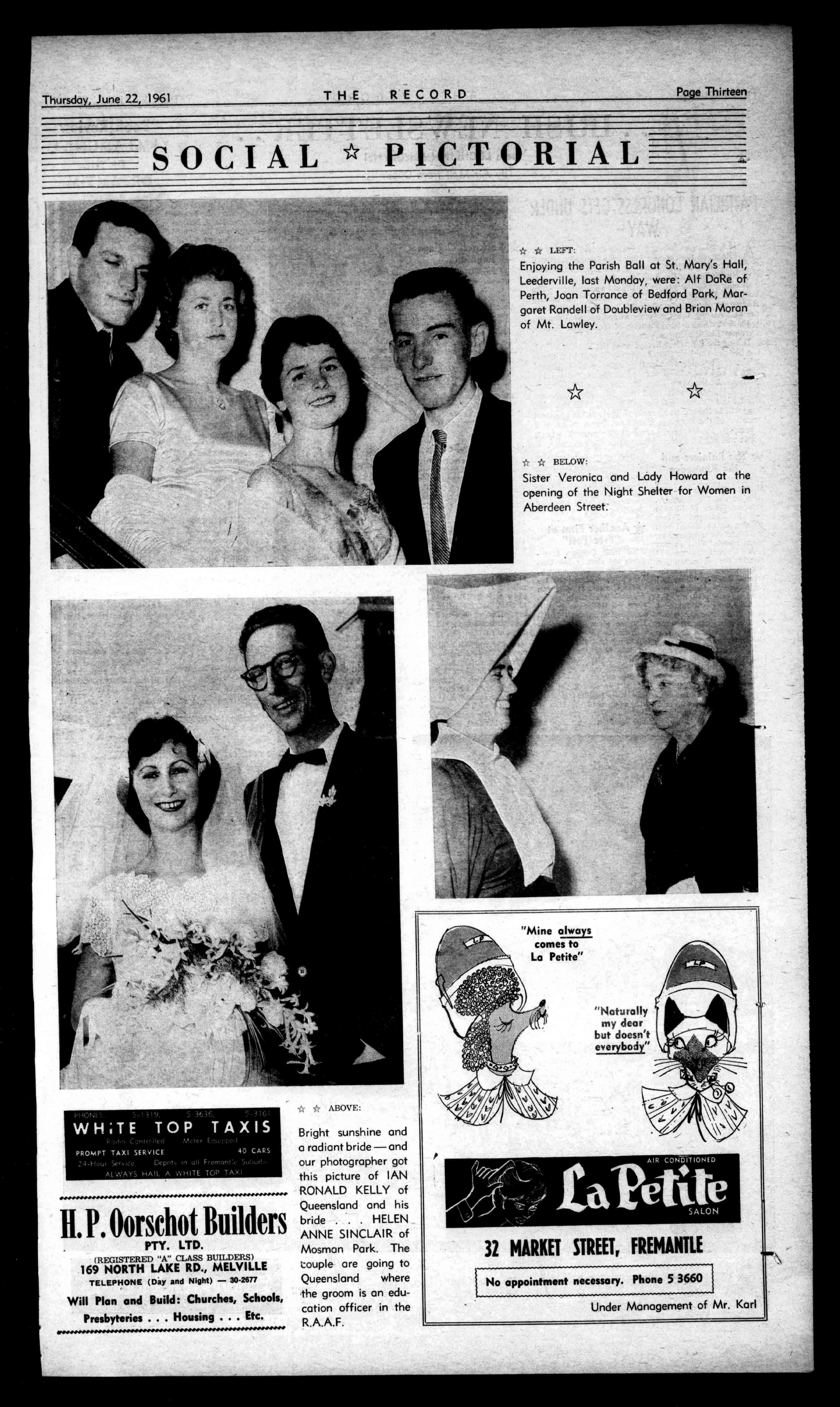 Upto£30trade-inonwoodor anytypestoveallowed.Besure compareourpricesforallmake. wood,gas,electricstoves,fridge., washingmachines.1stQuality ColouredAcidResistingLifetime BATHSonly 19.Imported6 WallTilesfrom29/-yd.Largest stocksofBaths,:Roves,Sinks, CupboardsInW.A.StainlessSteel Sinks,31t.toOft,antes.Stainless WashTroughs,£12/15/-.Iron grillebronzewireDoorsonly95/-. Stovesrelinedinhalfadayor tradedinonMetter&EVERROT andallmakesWood.Ong,Electric Stoves.BuildingandPlumbing suppliesE'sless. HASSELLS 553WellingtonSt.21-6301. SituationWanted EDUCATEDgirldesires postasmother'shelp,governessorhousekeeper.Box 8681thisoffice. DancingTuition FORModernBallroomDancingTuition,contactDorotheaMackie,255HayStreet East.Phone233311,243953. ToLet SOUTHPERTHsuitmarriedbusinesscouple.All mod.cons.Closeshopping, transport£5p.w.Apply Box8676thisoffice. Accommodation Wanted FORBus.Lady,furn.or unfurn,Nedlandspref.ReplyBox8675thisoffice. Accommodation AVAILABLE FORLADY,largeroom,all *facilities,8HazelStreet, Comm Handychurch, transport,shops.Applypersonally. Educational JUNIORphysicsandChemistryclasses,Saturdayafternoon2-5,SorrentoSchool ofSciencec/oSuiteEleven, LondonCourt.6guineasper termpersubject. GuestHouses CARR'SScarboroughGuest House,211WestCoastH.vy., Scarborough.Countrypeople speciallycateredfor.Temporaryorpermanent.Just likehome;T.V.Tel.25-1030. ADELAIDEvisitorsstayat "JasperHouse,"17Jasper St.,HydePark,S.A.Two milesfromG.P.O.andclose tobusstop.Carparkon premises.Childrenwelcome. Adults£1/5/-,children 12/6,forbedandbreakfast. T.V.available. GERALDTON.St.Francis GuestHouse.Telephone683. Bedandbreakfast15/night;othermealsoptional. TUCKERend AURISCH l'I''1 -'In 1012I1A1 PEKIII LOOK! '1Arrolf, GOINGWINDOWSHOPPINGTHISWEEK-END? ThenDon'tMissOurDisplayofClean,SoundVehicles SPECIALS 1954FORDZEPHYRSEDAN £395 THISWEEK: 1951HOLDENF.C.SEDAN £195 1935HOLDENF.JCTE 345 ECONOMICALMOTORS 226OXFORDSTREET,LEEDERVILLE F.11(PETER)COLLINS,Manager. Phone24-4760allImam