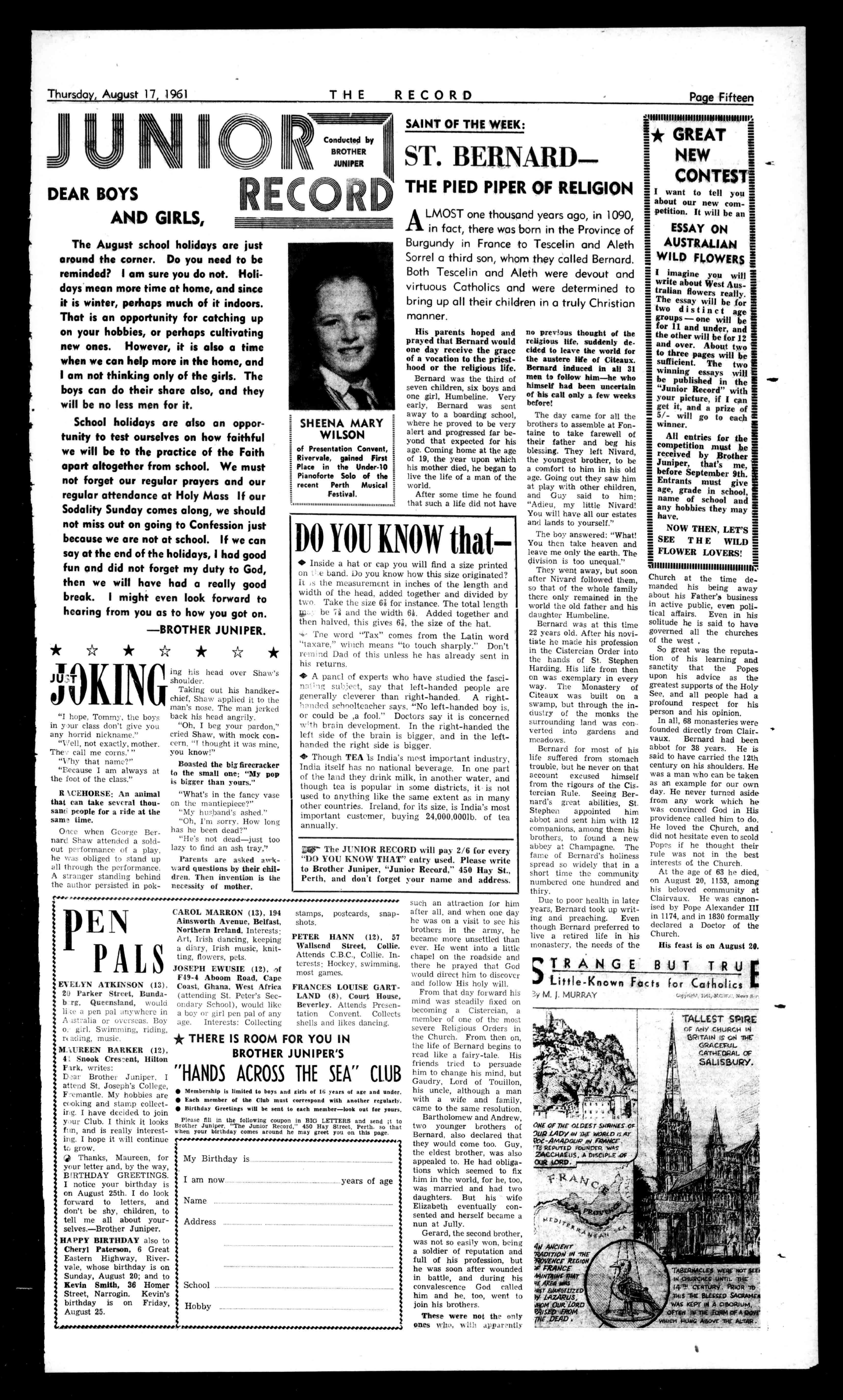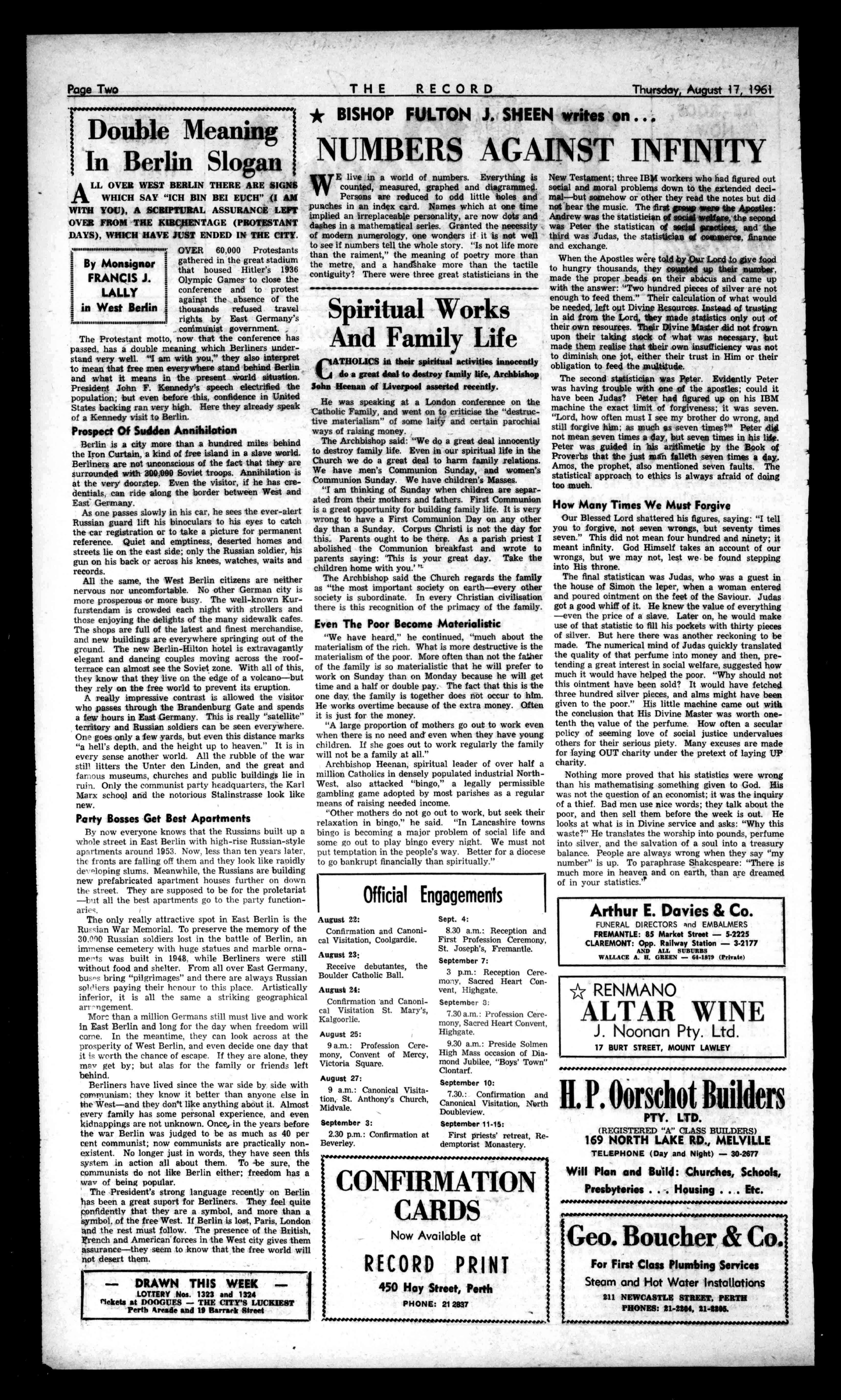 August22: ConfirmationandCanonicalVisitation,Coolgardie. August23: Receivedebutantes,the BoulderCatholicBall. August24: ConfirmationandCanonicalVisitationSt.Mary's, Kalgoorlie. August25: 9a.m.:ProfessionCeremony,ConventofMercy, VictoriaSquare. August27: 9a.m.:CanonicalVisitation,St.Anthony'sChurch, Midvale. September3: 2.30p.m.:Confirmationat Beverley. Sept.4: 8.30a.m.:Receptionand FirstProfessionCeremony, St.Joseph's,Fremantle. September7: 3p.m.:ReceptionCeremony,SacredHeartConvent,Highgate, September3: 7.30a.m.:ProfessionCeremony,SacredHeartConvent, Highgate. 9.30a.m.:PresideSolmen HighMassoccasionofDiamondJubilee,"Boys'Town" Clontarf. September10: 7.30.:Confirmationand CanonicalVisitation,North Doubleview. September11-15: Firstpriests'retreat,RedemptoristMonastery. CONFIRMATION CARDS NowAvailableat RECORDPRINT 450HayStreet,Perth PHONE:212837 MINI.14.04.0414.41414/4/VIVIMIWN14.0.044141.....1.4.0....M.P.P.'