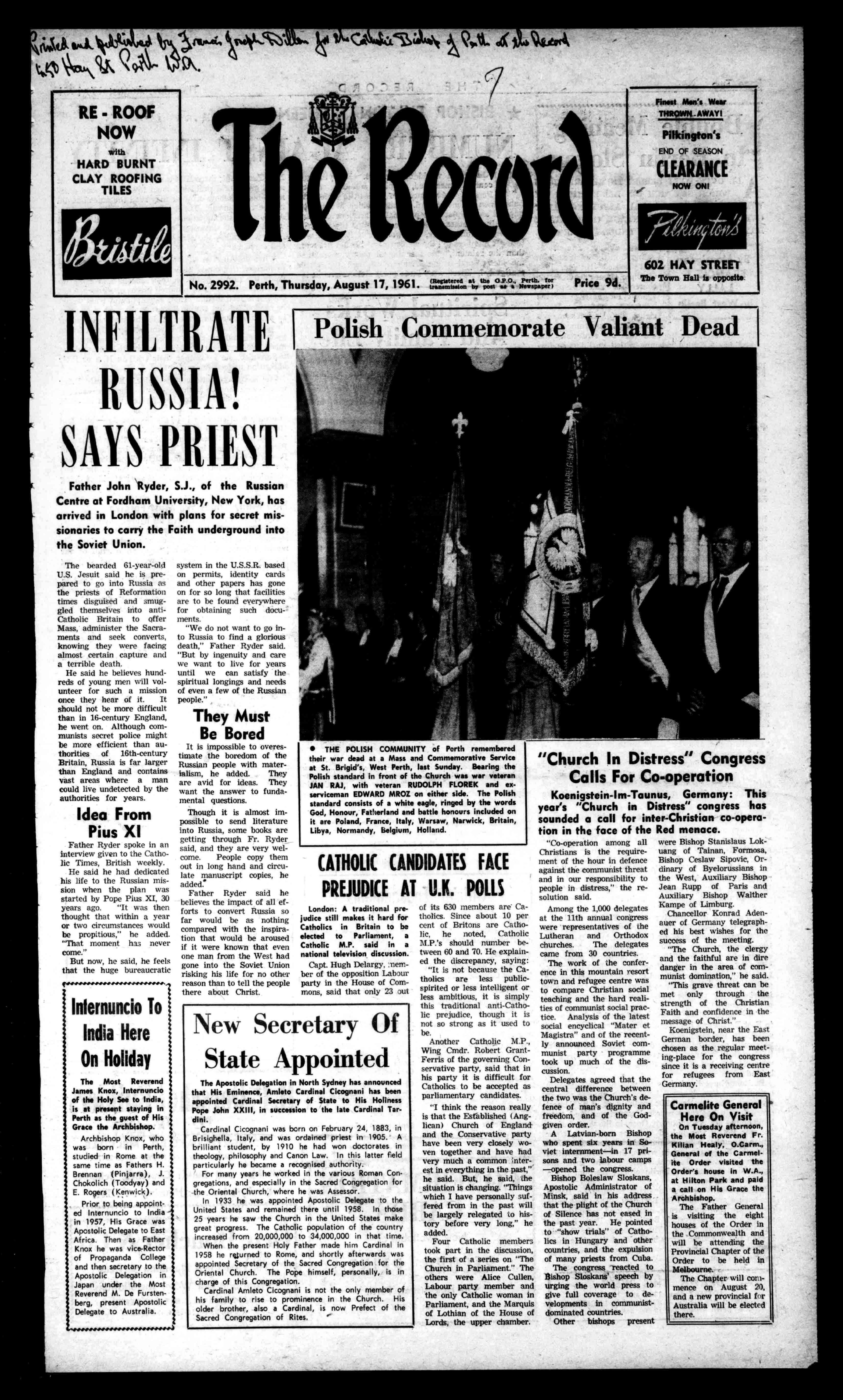 440.1 k*VZ° 1\fL'"tAle)tL5 9,.k/"4%LOA RE-ROOF NOW with HARDBURNT CLAYROOFING TILES No.2992.Perth,Thursday,August17, 1961.(Registeredatthe°P0Perth.for transmissionirepoet aNewspaper Price9d. FinestMen'sWear THROWNAWAYt PiHrington's ENDOFSEASON CLEARANCE NOWONI 602HAYSTREET TheTownHallisopposite