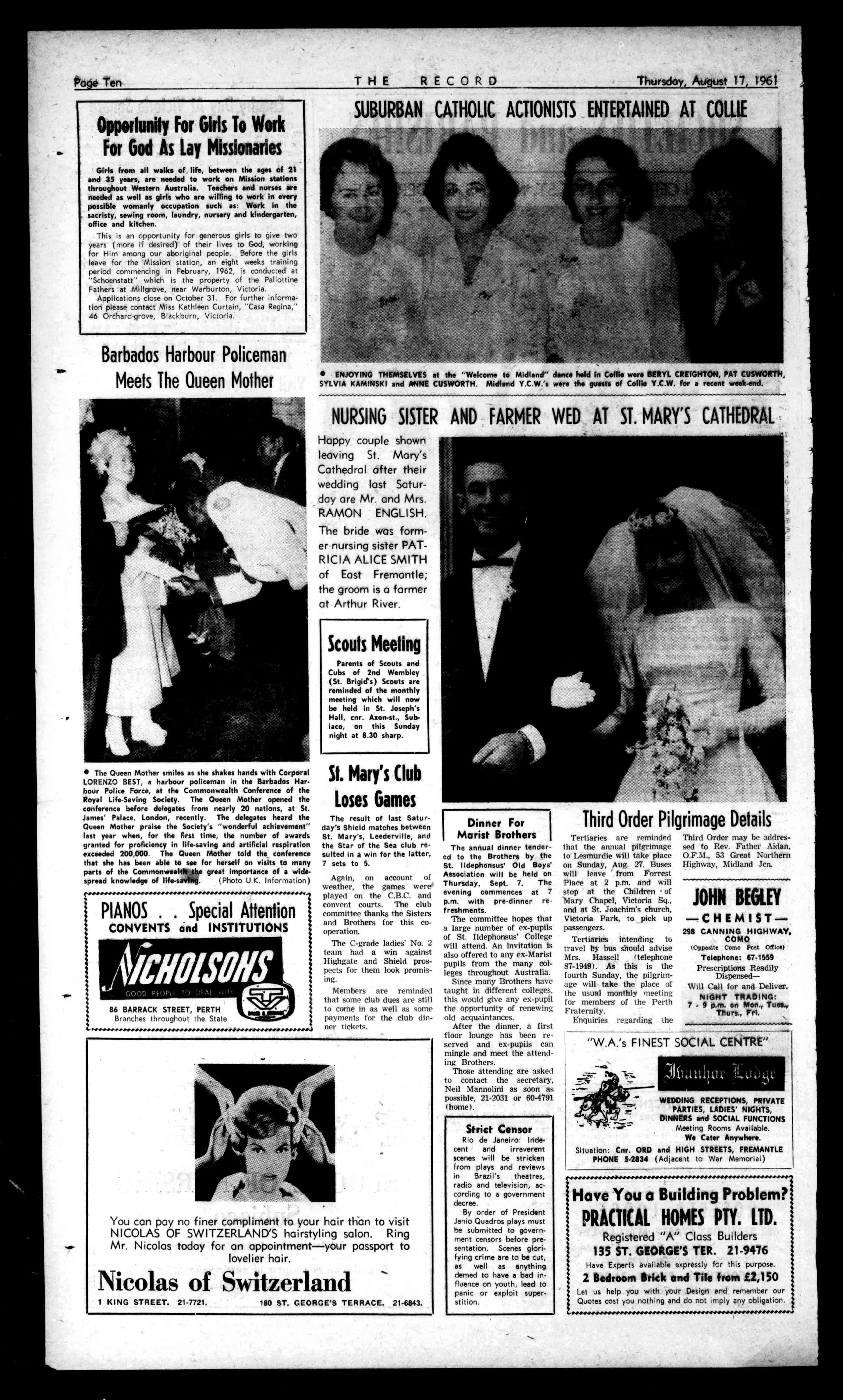 Bedandbreakfast17/6 night;othermealsoptional. ADELAIDEvisitorsstayat "JasperHouse,"17Jasper St.,HydePark,S.A.Two milesfromG.P.O.andclose tobusstep.Carparkon premises.Childrenwelcome. Adults£1/5/-,children 12/6,forbedandbreakfast. T.V.available. HASSELLSAMAZINGBAEOAINS Upto£30trade-inonwoodor anytypestoveallowed.Besure compareourpricesforallmakes wood.gas,electricstoves,fridge., Washingmachines.letQualn7 ColouredAcidResistingLifetime BATHSonly£19.Imported6g6 WallTilesfrom20/-yd.Largest stockeofBathe,Stoves,Sink., Cupboard.inW.A.ElloinlemSteel Sinks,31t.to7ft,sines.Stainless WashTroughs. 12/15/-.Iron grillehenna.wireDoorsonly95/.. StovesyennedInhalfadayCr tradedinonMetter.EVERHOT andallmakesWood,Oa,,Electric Stoves.BuildingandPlumbing supplieseless. HASSELLS 553WellingtonSt.11-6307. EUROPEAN CLUB NIGHTCLUBAND RESTA1711.ANT 57LAKEST.,PERTH Telephone:23-1589 PARTIESandSOCIALS SPECIALLYCATEREDFOR (AlsoenSundays). PrintedandpublishedbyFrancis JosephDillon,"TheRecord"office. 450Hay-et.,Perth. LOOK! GOINGWINDOWSHOPPINGTHISWEEK-END? ThenDon'tMissOurDisplayofClean,SoundVehicles THISWEEK: SPECIALS 1960F.B.HOLDENSPECIALSEDAN £985 1960P.B.HOLDENUTILITY £710 1954HILLMANESTATECAR,39.000[Ills£425 ECONOMICALMOTORS 226OXFORDSTREET,LEEDERVILLE F.H(PETER)COLLINS,Manager, Phone24-4760allhours.